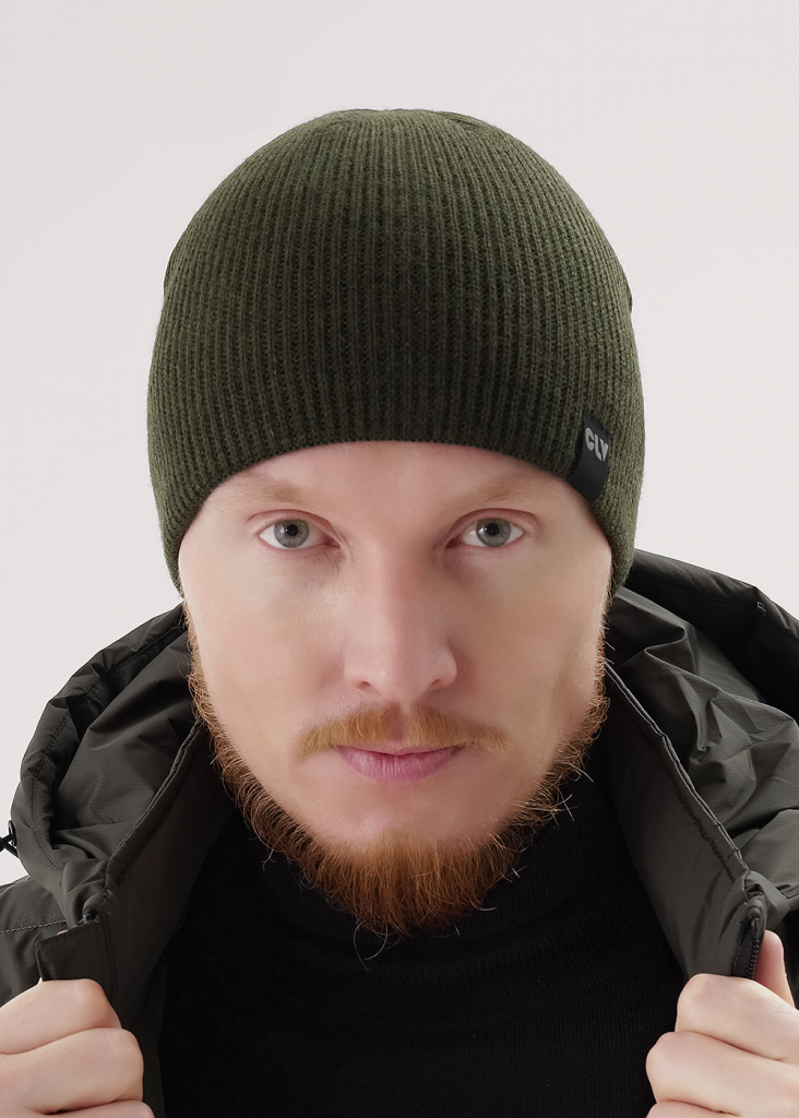 Шапка мужская двойная, без отворота, без подклада. Выполнена из высококачественной пряжи с добавлением шерсти, декорирована стильной нашивкой.