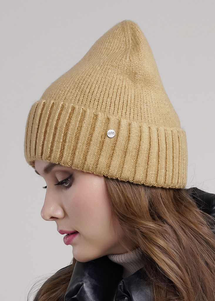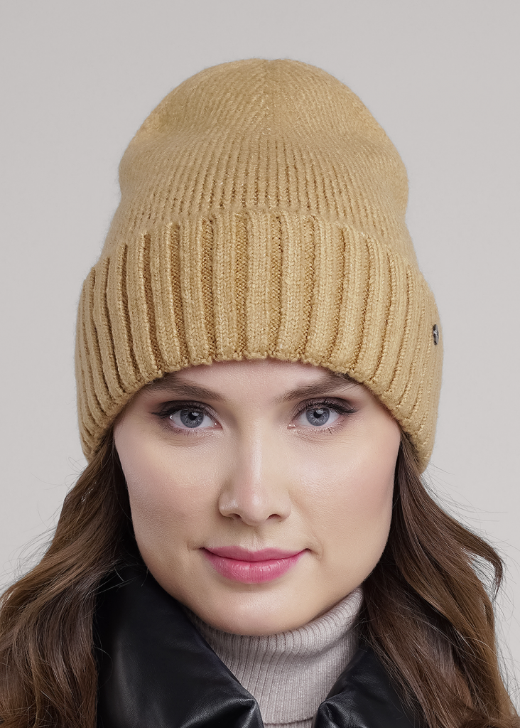 Шапка женская однослойная с отворотом, без подклада. Выполнена из высококачественной пряжи, декорирована стильной нашивкой. Станет не только отличной защитой от холода, но и модным аксессуаром.