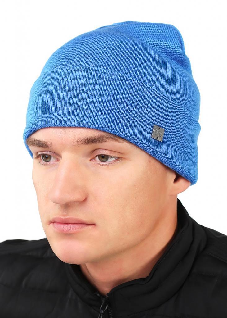 Шапка, связанная гладью, с отворотом, с небольшим напуском, декорирована имиджевой логотипом-нашивкой, без утепления на флисе. Размер 58.