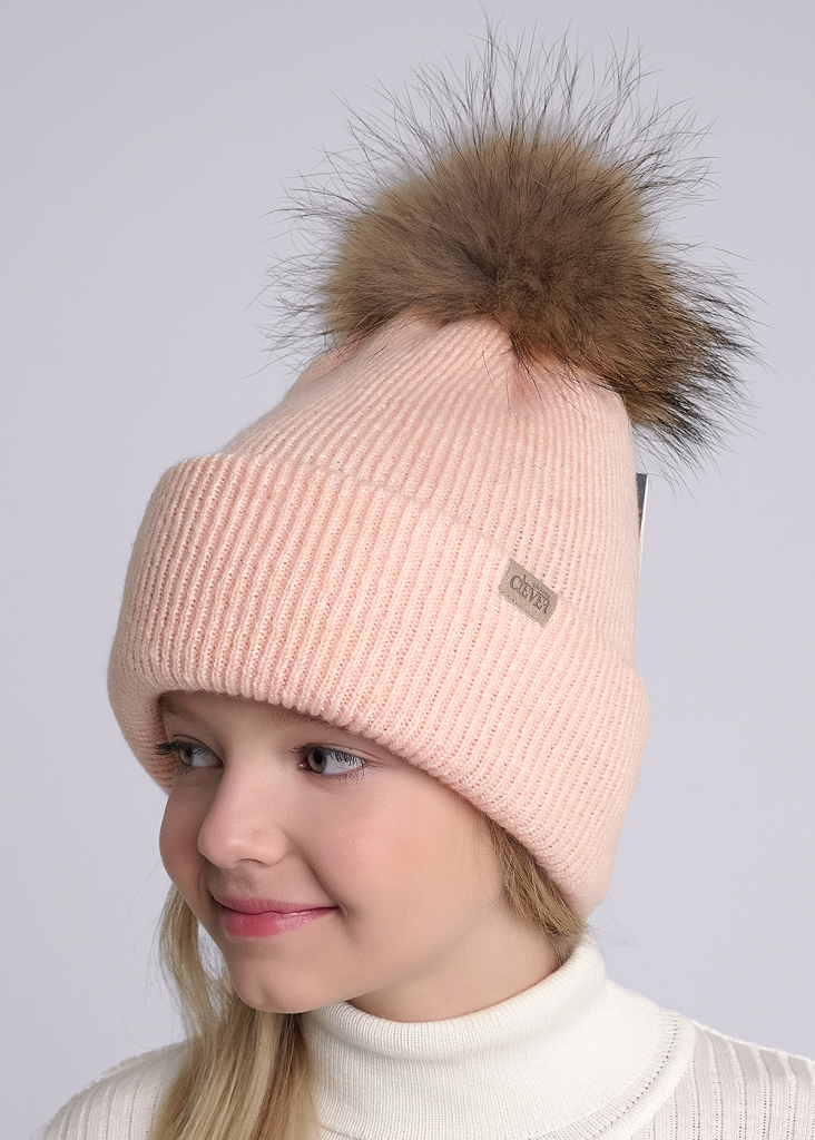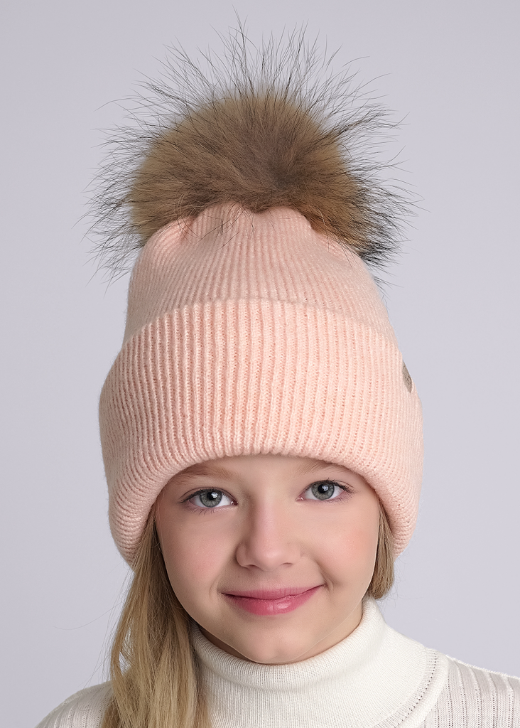 Двойная детская шапка с отворотом, декорирована нашивкой логотип и меховым помпоном. Идеально подойдёт для холодной зимы.
