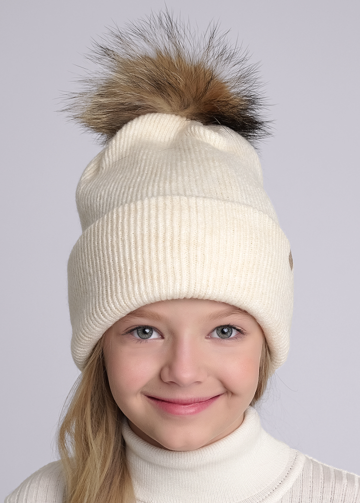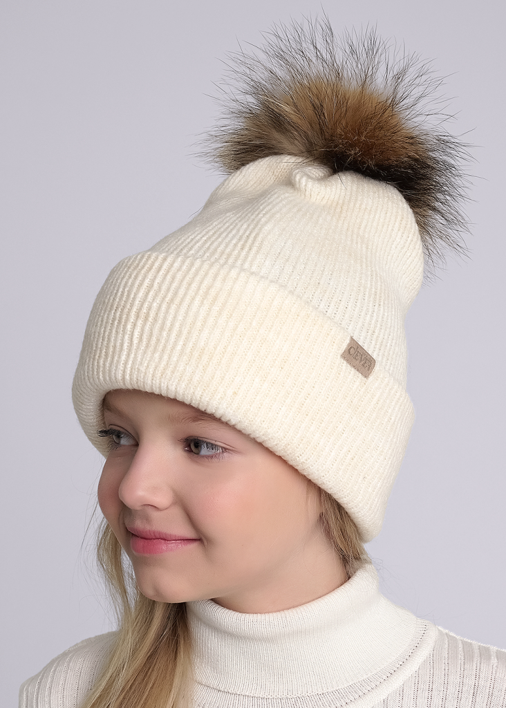 Двойная детская шапка с отворотом, декорирована нашивкой логотип и меховым помпоном. Идеально подойдёт для холодной зимы.