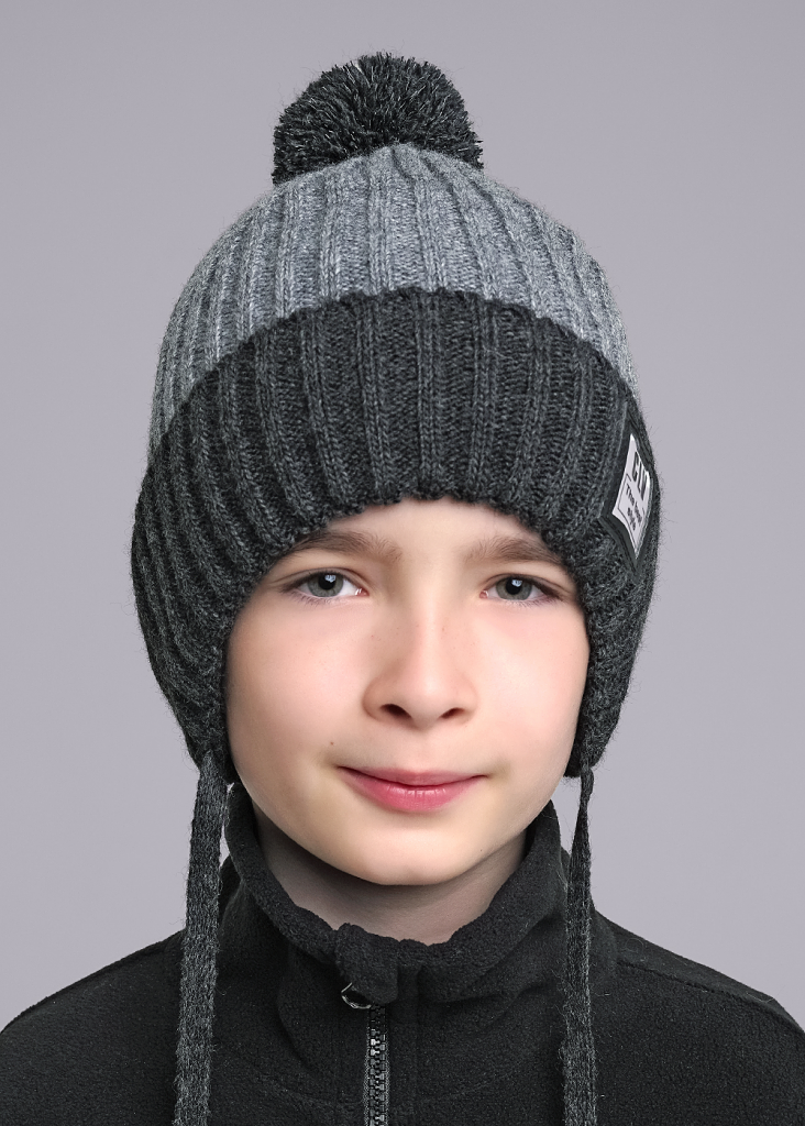 Детская шапка с отворотом на завязках. Декорирована стильной нашивкой в височной зоне и ниточным помпоном. Утепление флисом и синтепоном по всей голове. Идеально подойдёт для холодной зимы.