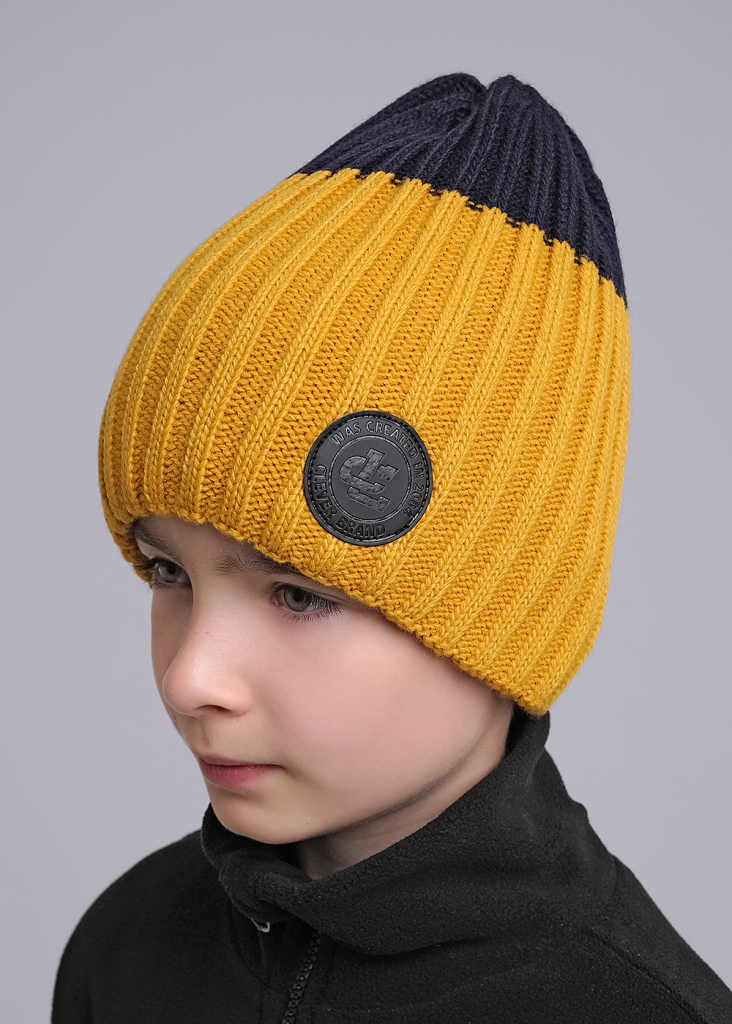 Шапка детская двойная для мальчика, декорирована стильной нашивкой в височной зоне. Отлично подойдёт для зимы.