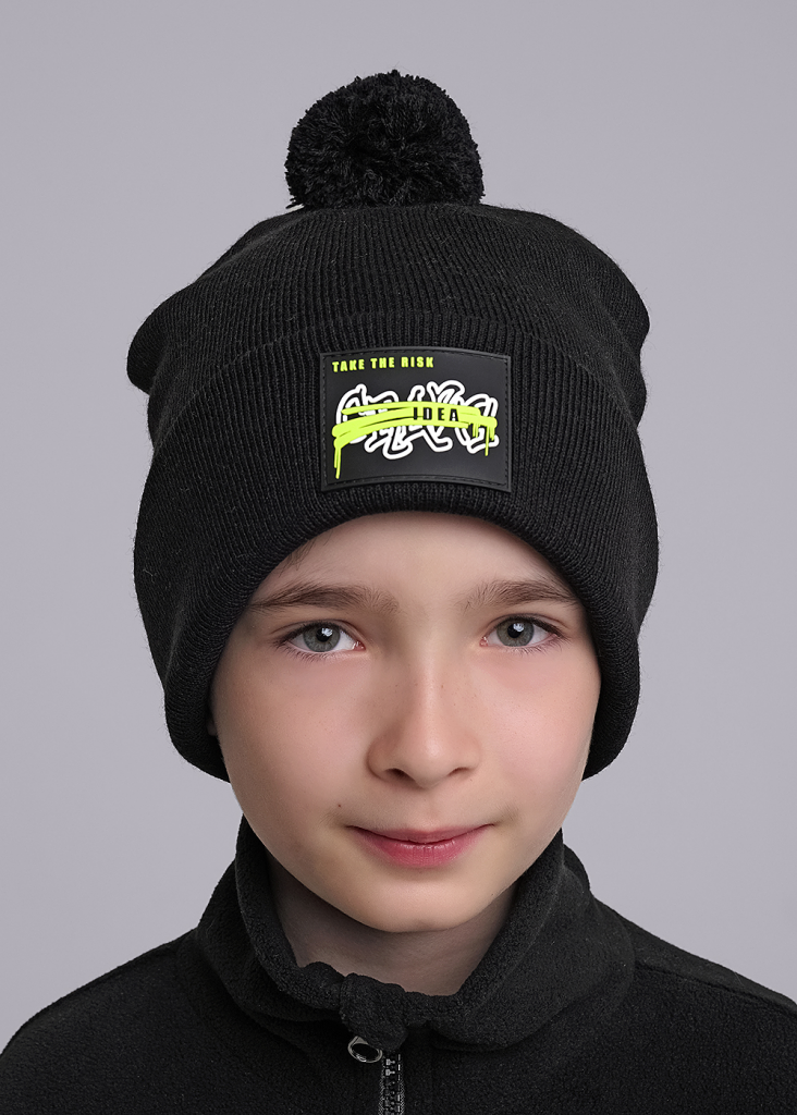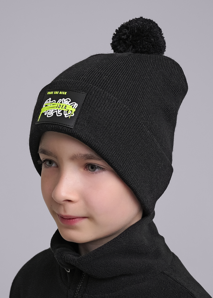 Детская двойная шапка с отворотом, декорирована стильной нашивкой в центральной части и ниточным помпоном. Идеально подойдёт для зимы.