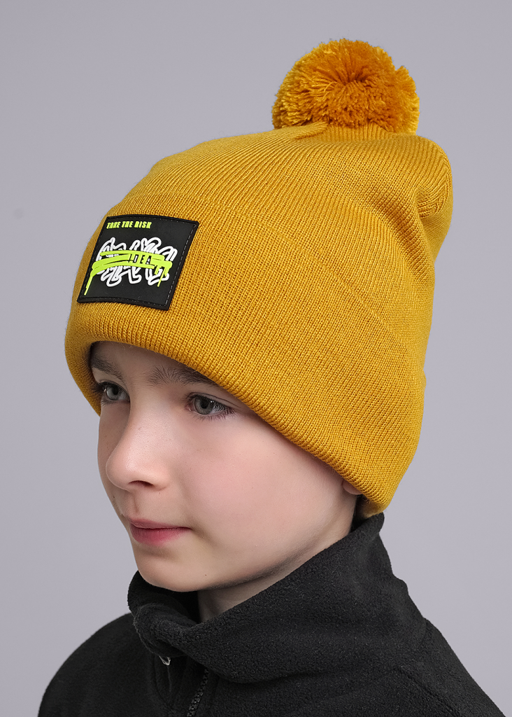 Детская двойная шапка с отворотом, декорирована стильной нашивкой в центральной части и ниточным помпоном. Идеально подойдёт для зимы.