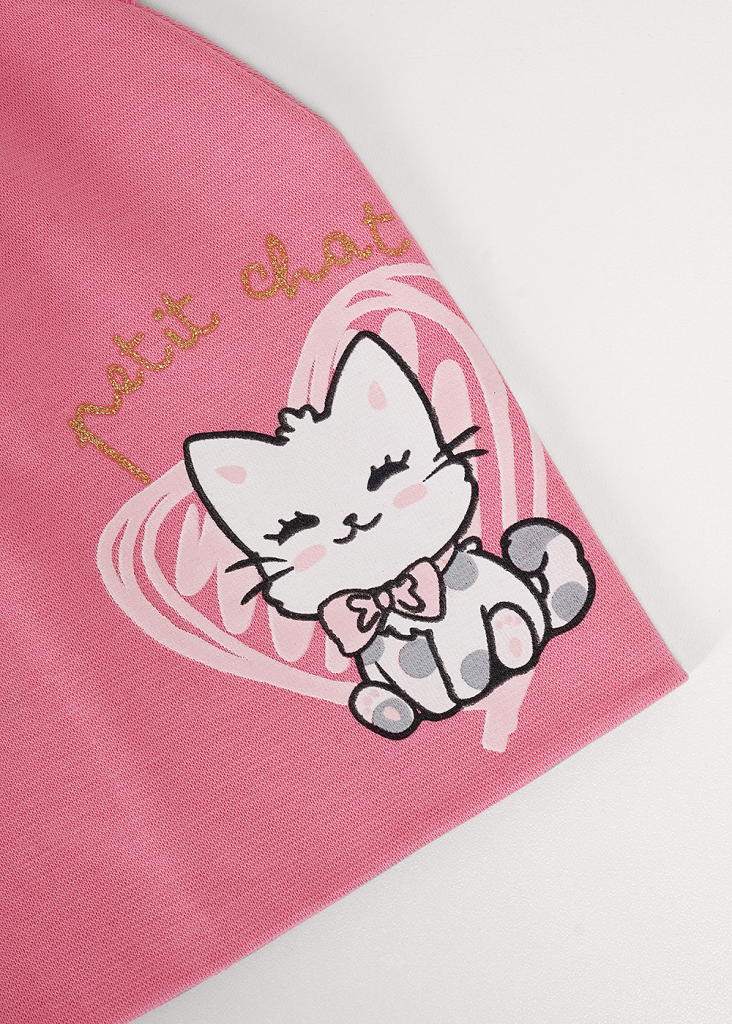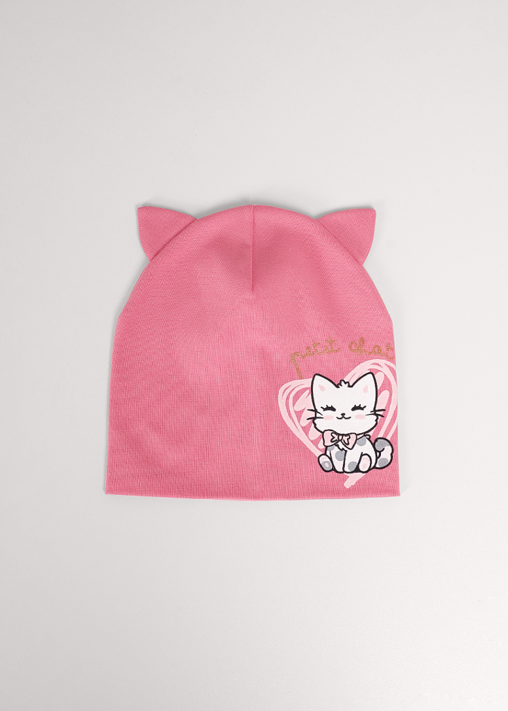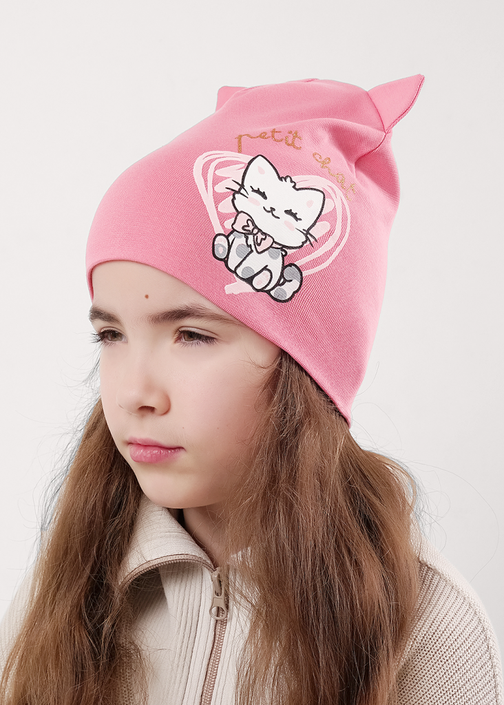 Шапка двойная без отворота, декорирована ушками и принтом.