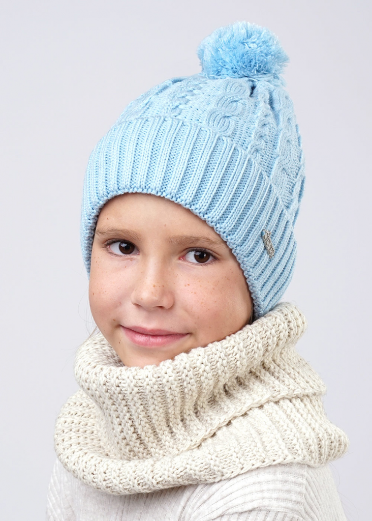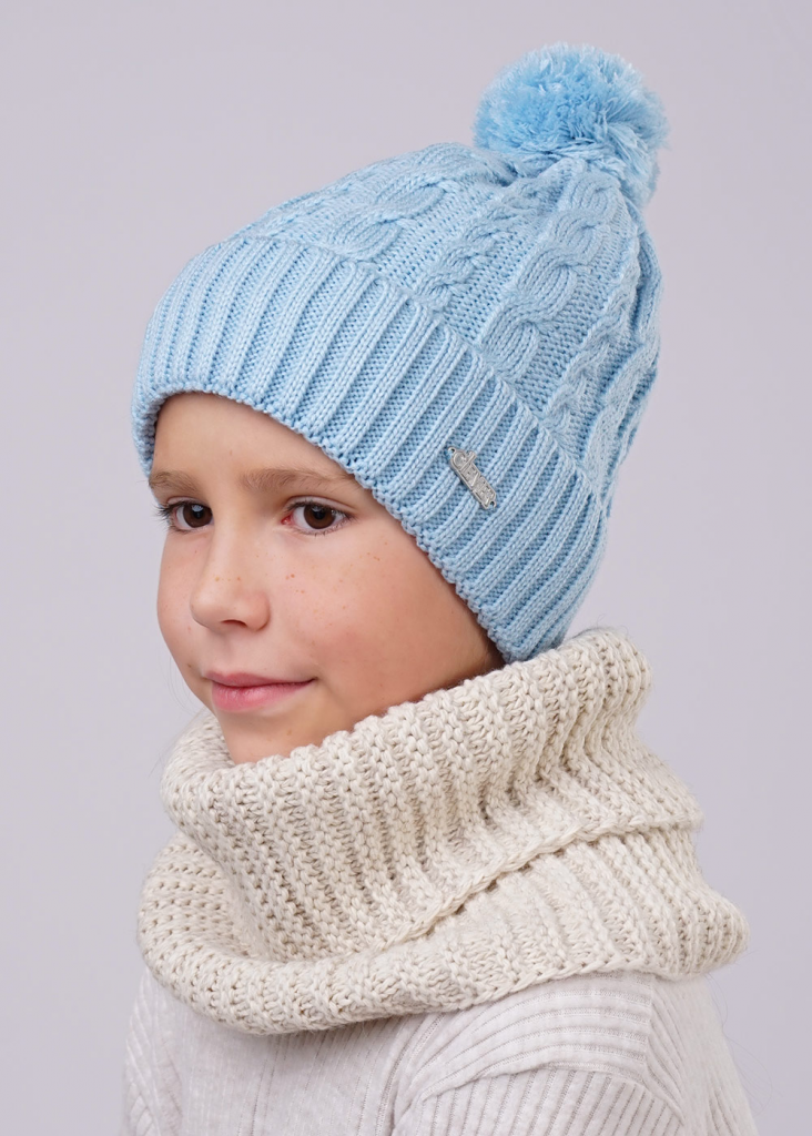 Детская шапка на флисовом подкладе, выполнена фактурным переплетением "косы" из акриловой пряжи и декорирована ниточным помпоном и нашивкой на отвороте.