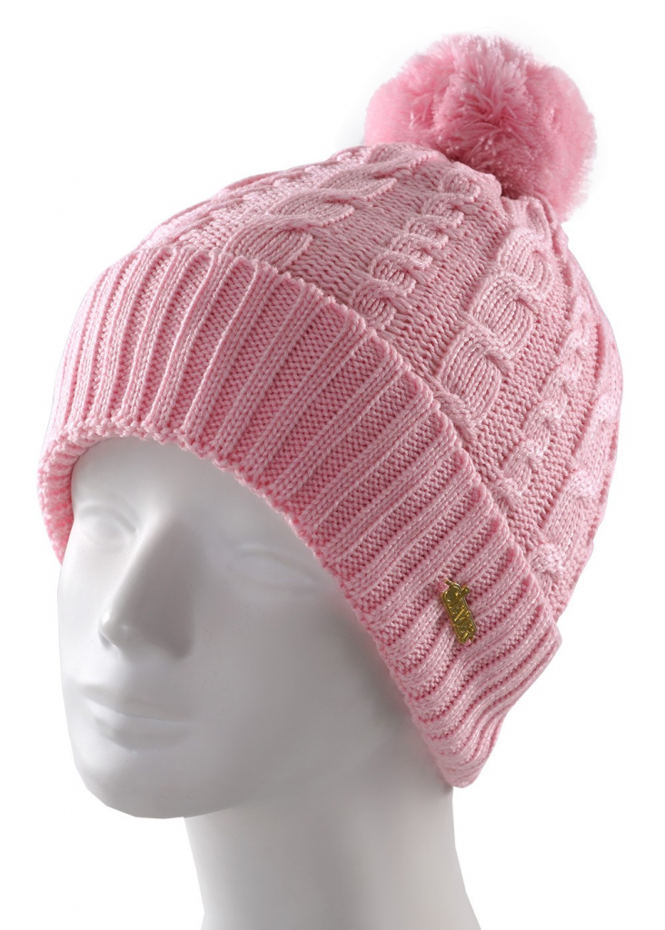 Детская шапка на флисовом подкладе, выполнена фактурным переплетением "косы" из акриловой пряжи и декорирована ниточным помпоном и нашивкой на отвороте.