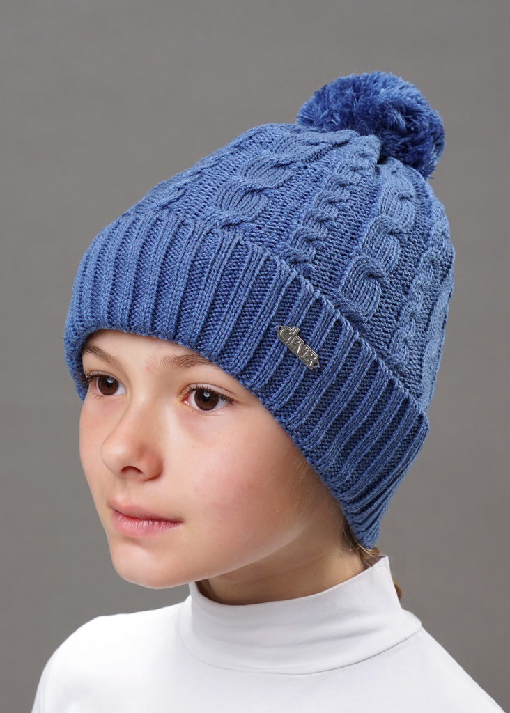 Детская шапка на флисовом подкладе, выполнена фактурным переплетением "косы" из акриловой пряжи и декорирована ниточным помпоном и нашивкой на отвороте.