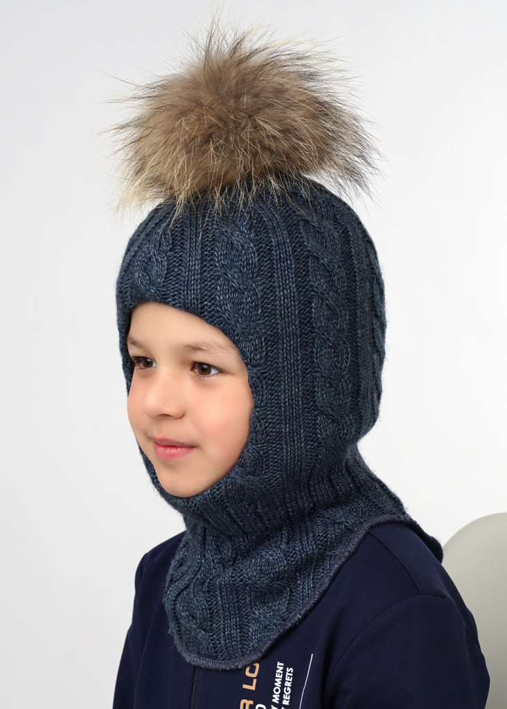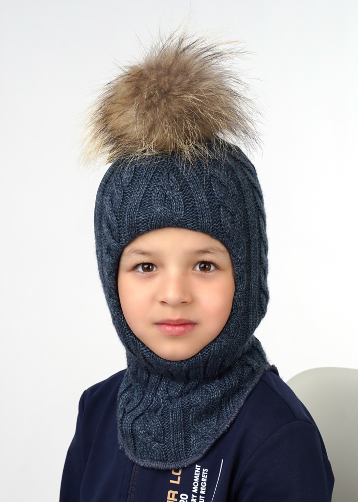Шапка-шлем выполнен фактурным переплетением "косы", в области шеи - ластичная ножка для более плотного прилегания. Модель на синтепоне с хлопковым подкладом и натуральным помпоном на кнопке.