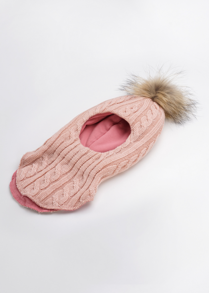 Шапка-шлем выполнен фактурным переплетением "косы", в области шеи - ластичная ножка для более плотного прилегания. Модель на синтепоне с хлопковым подкладом и натуральным помпоном на кнопке.
