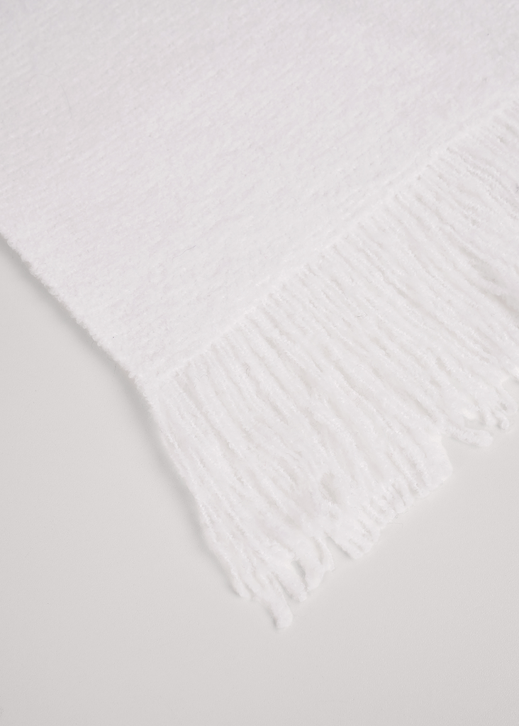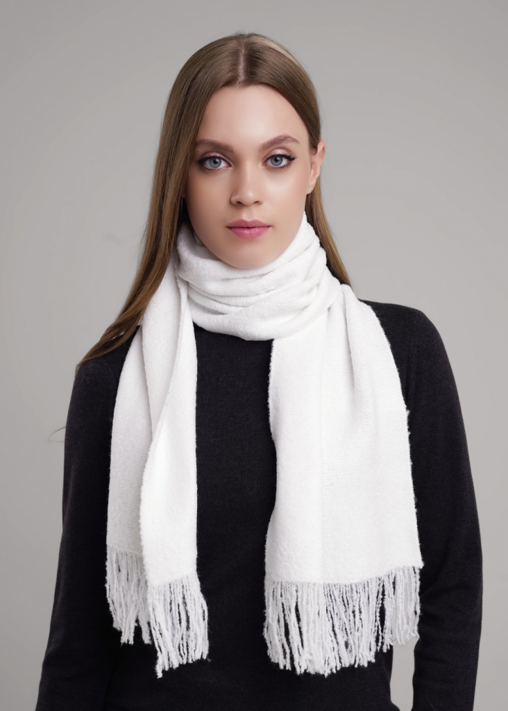 Обемный женский теплый шарф с декоративной бахромой, идеально подходящий для того, чтобы укутаться в него в холодные дни.