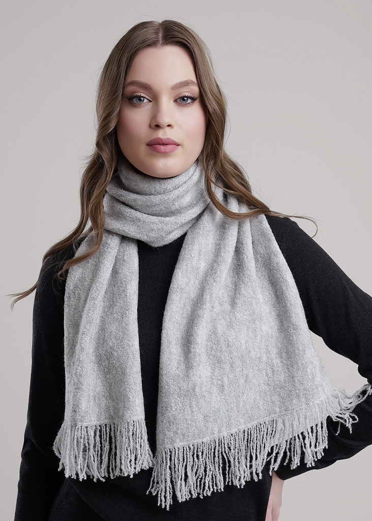 Обемный женский теплый шарф с декоративной бахромой, идеально подходящий для того, чтобы укутаться в него в холодные дни.