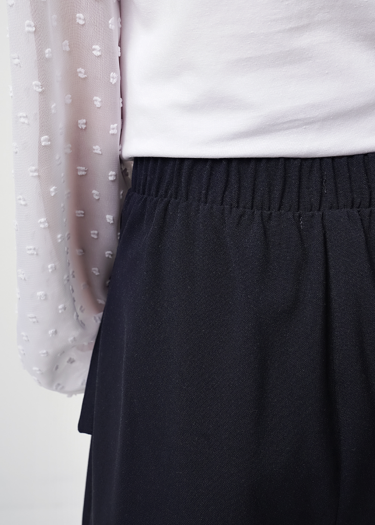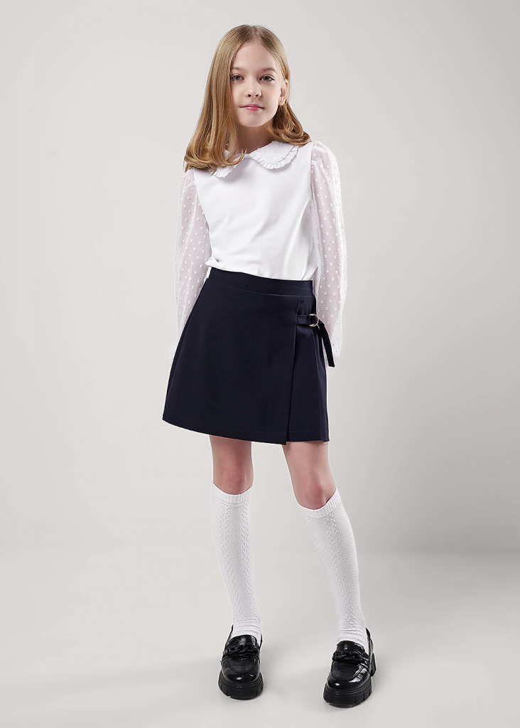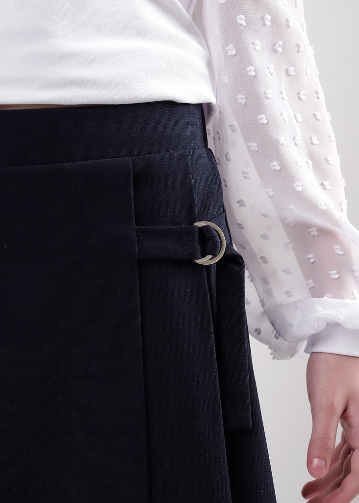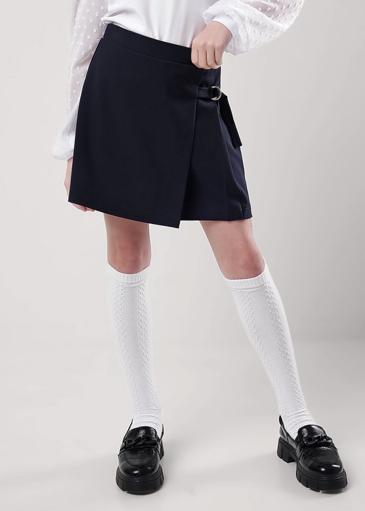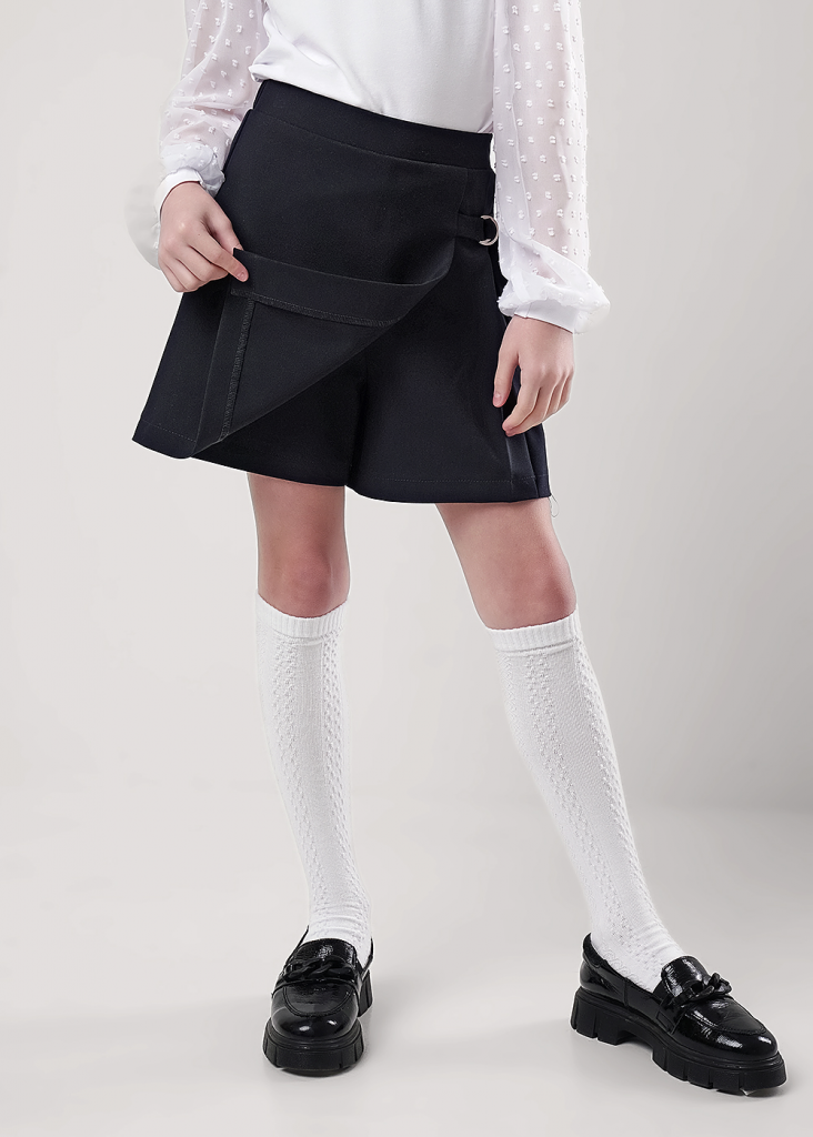 Юбка- шорты- отличное дополнение к вашему гардеробу! Асимметричная модель со складками с одной стороны дополнена декоративным хлястиком с пряжкой. Модель отлично подойдёт для создания повседневного школьного образа и отличного настроения!