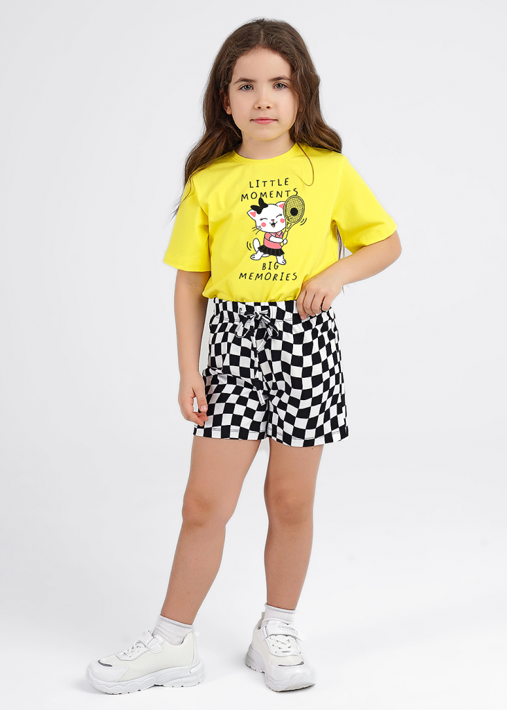Прямые шорты в "шахматку" выполнены из эластичного хлопкового трикотажа. Эластичный пояс, регулировка шнуром. Сочетайте модель с однотонными или принтованными футболками из коллекции.