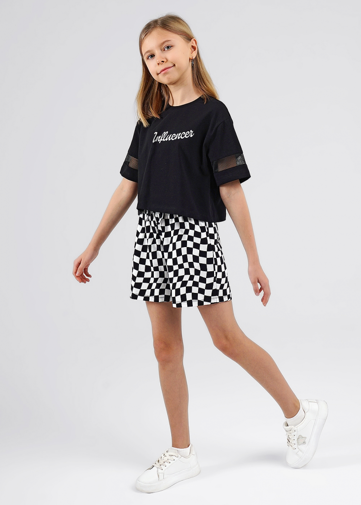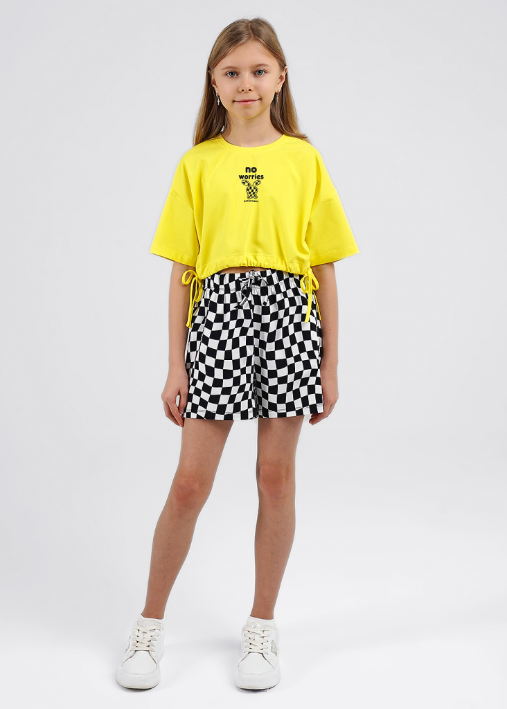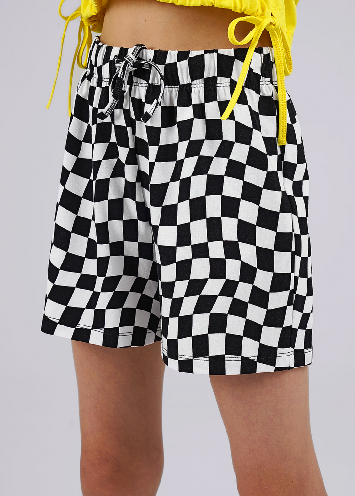 Прямые шорты в "шахматку" выполнены из эластичного хлопкового трикотажа. Эластичный пояс, регулировка шнуром. Сочетайте модель с однотонными или принтованными футболками из коллекции.