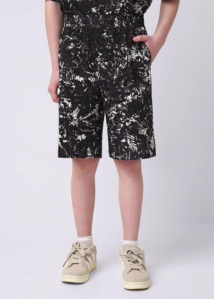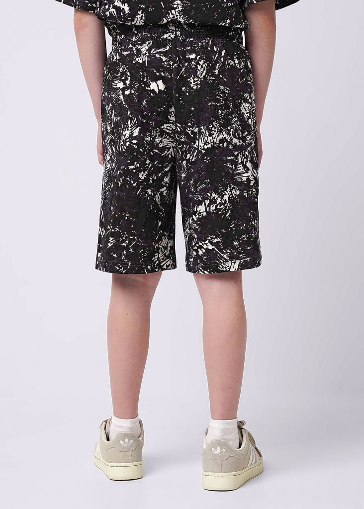 Шорты из хлопка средней длины в трендовую набивку. Для функциональности добавлены карманы в отрезном бочке, резинка и кипер в пояс.
