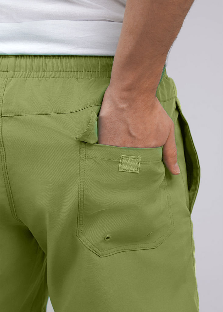 Однотонные мужские купальные шорты с подкладом-плавками из мягкой сетки. Для функциональности предусмотрен широкий пояс, карманы и регулируемый шнур. Данная модель шорт хорошо подходит для плавания и пляжного отдыха.