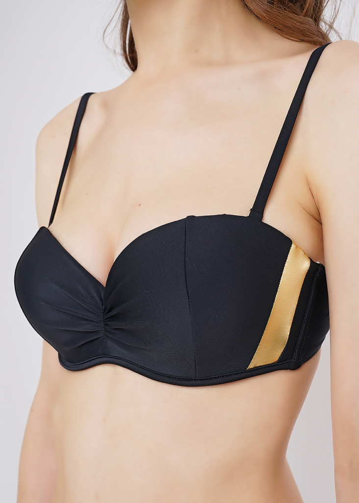 Купальник-бандо с формованными чашками и съемными вкладышами push-up. Брители съемные на регулировках. Трусы - бикини стандартной посадки.