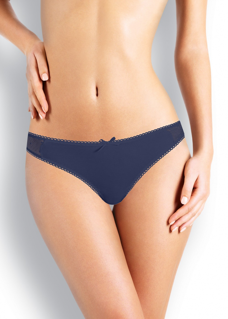 Трусы стринги женские из эластичного хлопкового полотна. Спинка и вставки по переду из сетки. Обработка краев - ажурная резинка с фестоном. Спереди бант.