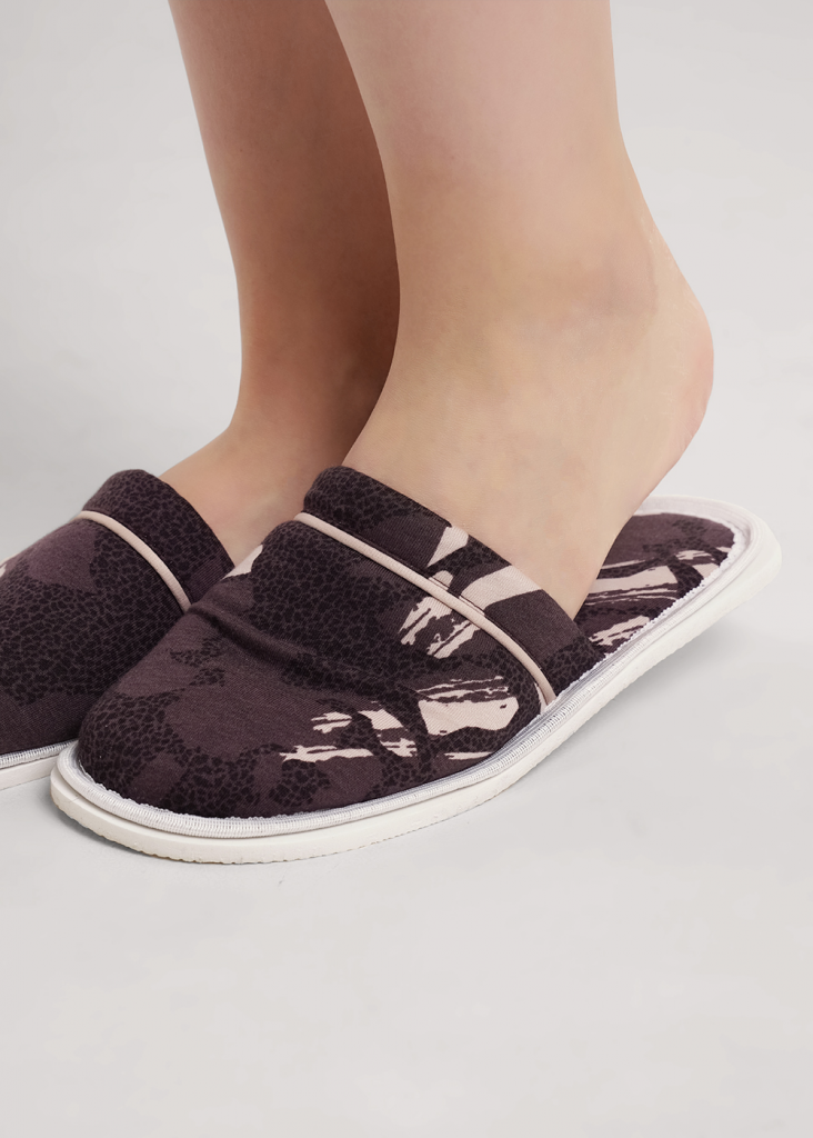 Лёгкие, домашние тапочки с закрытым носом из хлопкового трикотажного полотна с добавлением модала. В верхней части тапок контрастный кант. Толстая подошва.