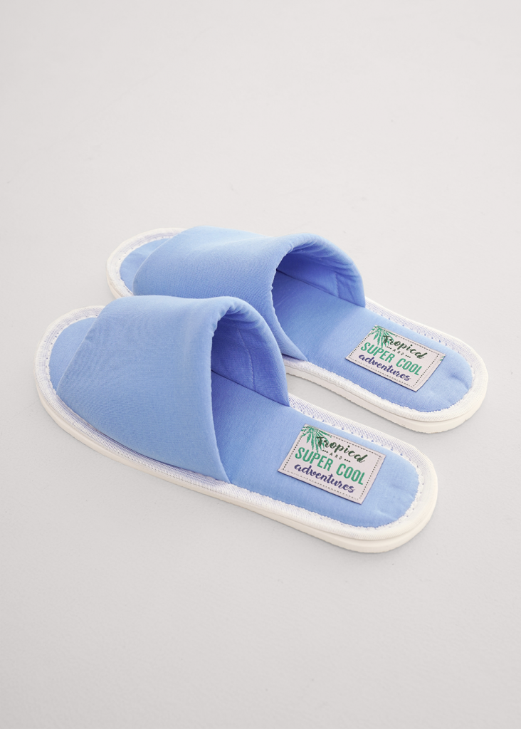 Лёгкие, домашние тапочки с открытым носом из хлопкового трикотажного полотна , нашивка. Толстая подошва.