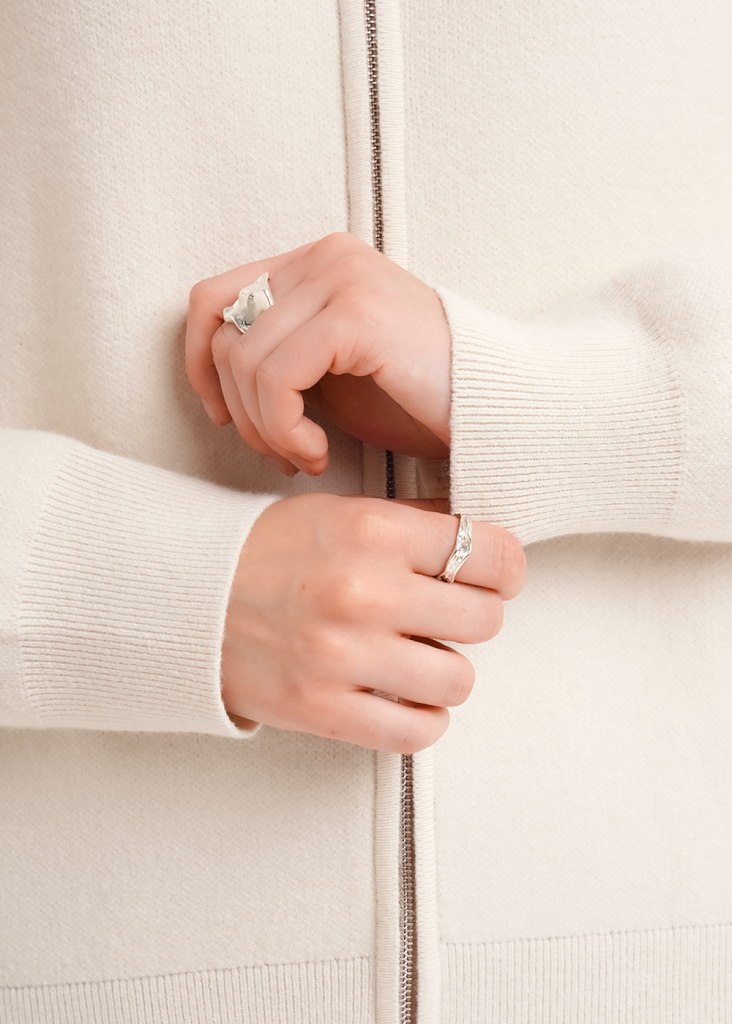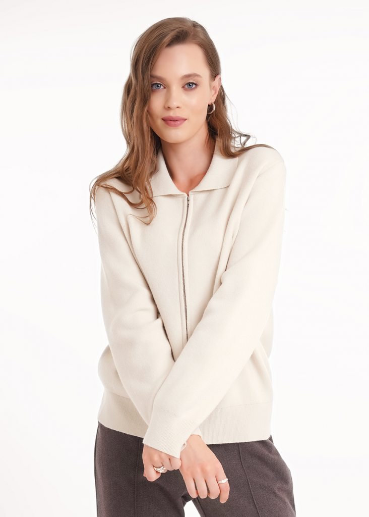 Вязаный жакет из вискозной пряжи с добавлением акрила, свободного силуэта на молнии переплетения гладь. По горловине отложной воротник. Длинный втачной рукав. По низу изделия и рукавов манжеты. По воротнику и манжетам ластичное переплетение.