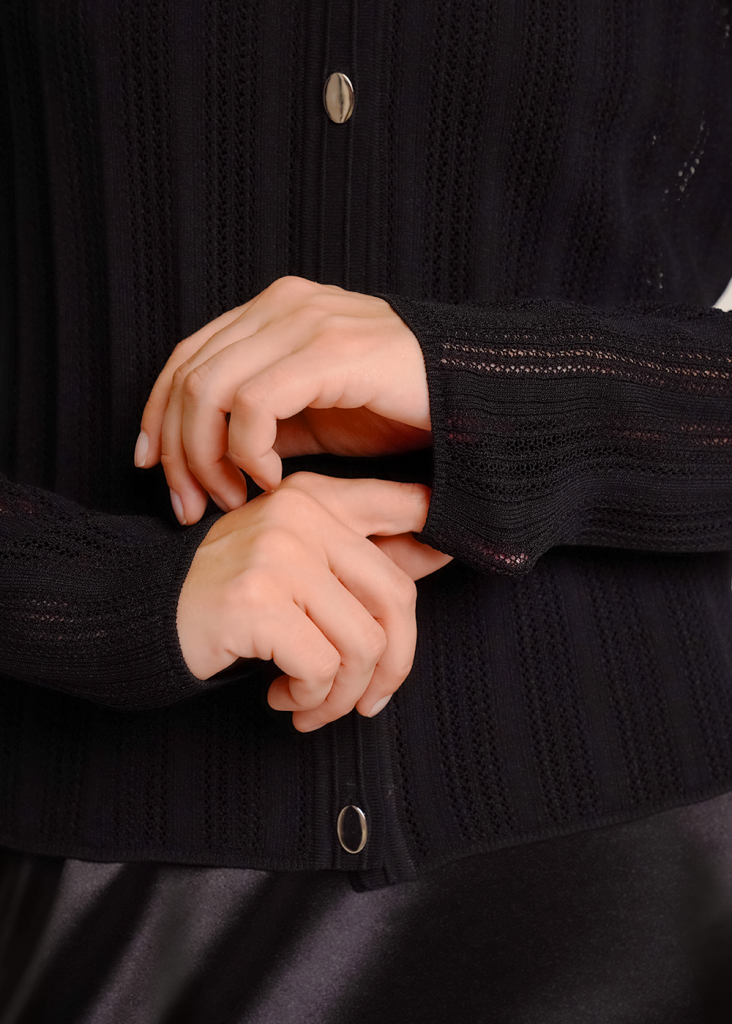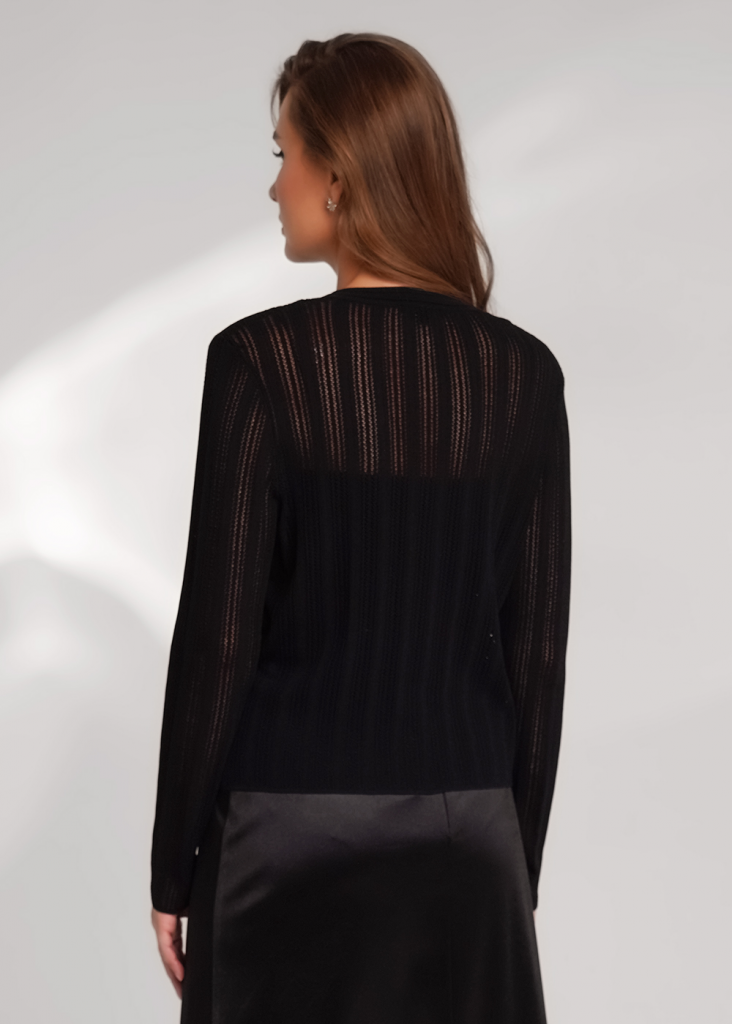 Вязаный жакет прямого силуэта из вискозной пряжи, ажурного переплетения. Втачной длинный рукав. Округлая горловина с бейкой. По переду планка с застежкой на пуговицы.