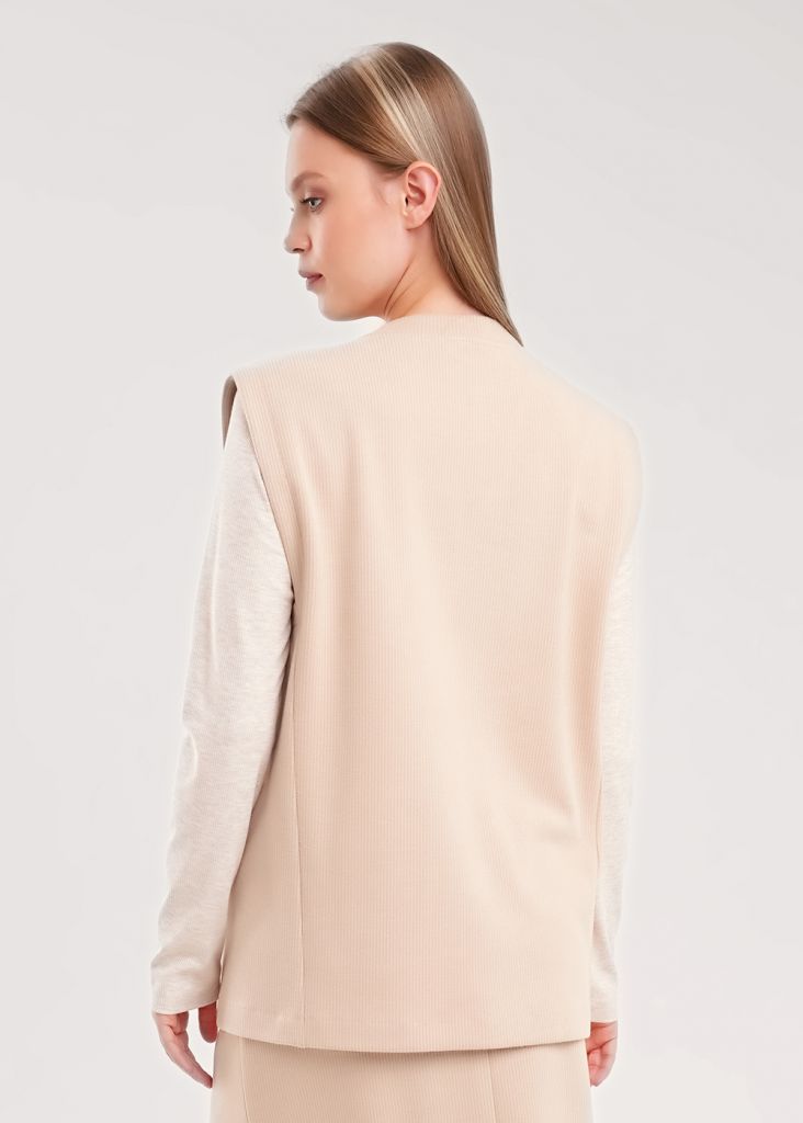 Жилет из трикотажного поливискозного полотна джерси, прямого кроя. Округлая горловина с обтачкой. По пройме подкройная обтачка. Спереди резы со шлицей и декоративными клапанами. По низу изделия потайной стежок.
