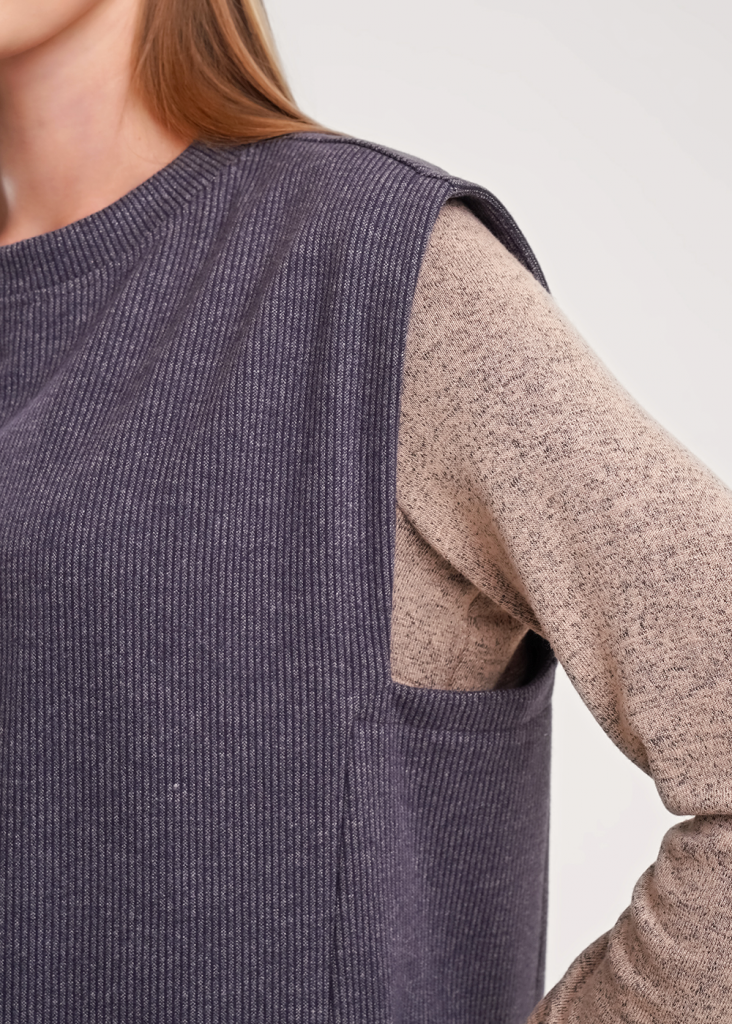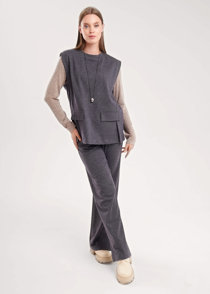 Жилет из трикотажного поливискозного полотна джерси, прямого кроя. Округлая горловина с обтачкой. По пройме подкройная обтачка. Спереди резы со шлицей и декоративными клапанами. По низу изделия потайной стежок.