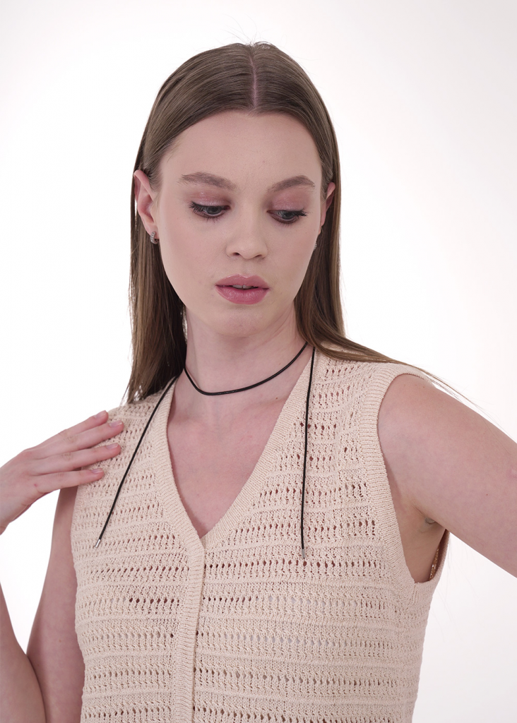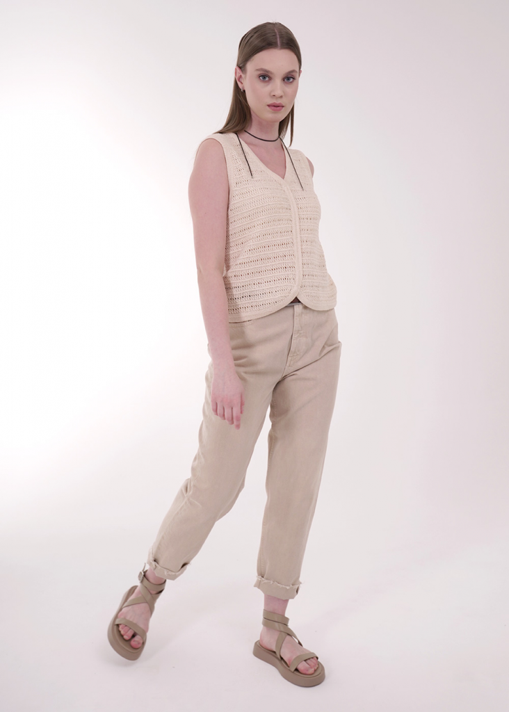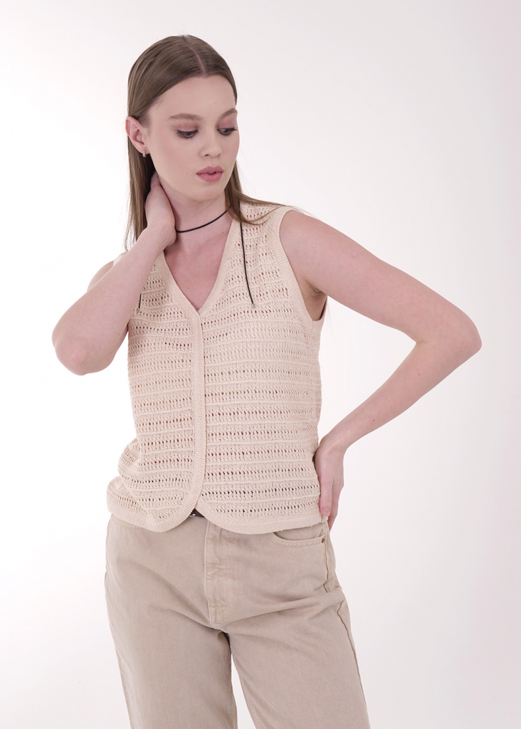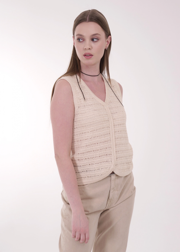 Вязаный жилет прямого силуэта из акриловой пряжи ажурного переплетения. V-образный вырез горловины. По борту имитация застежки, бейка без пуговиц. По горловине, пройме и низу изделия бейка.