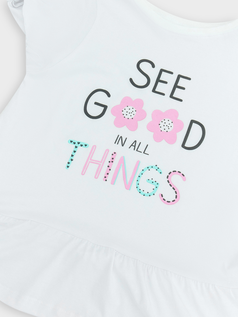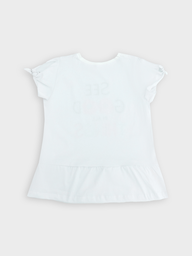 Перед и спинка с отрезной рюшей по низу. Горловина круглой формы. Обработана