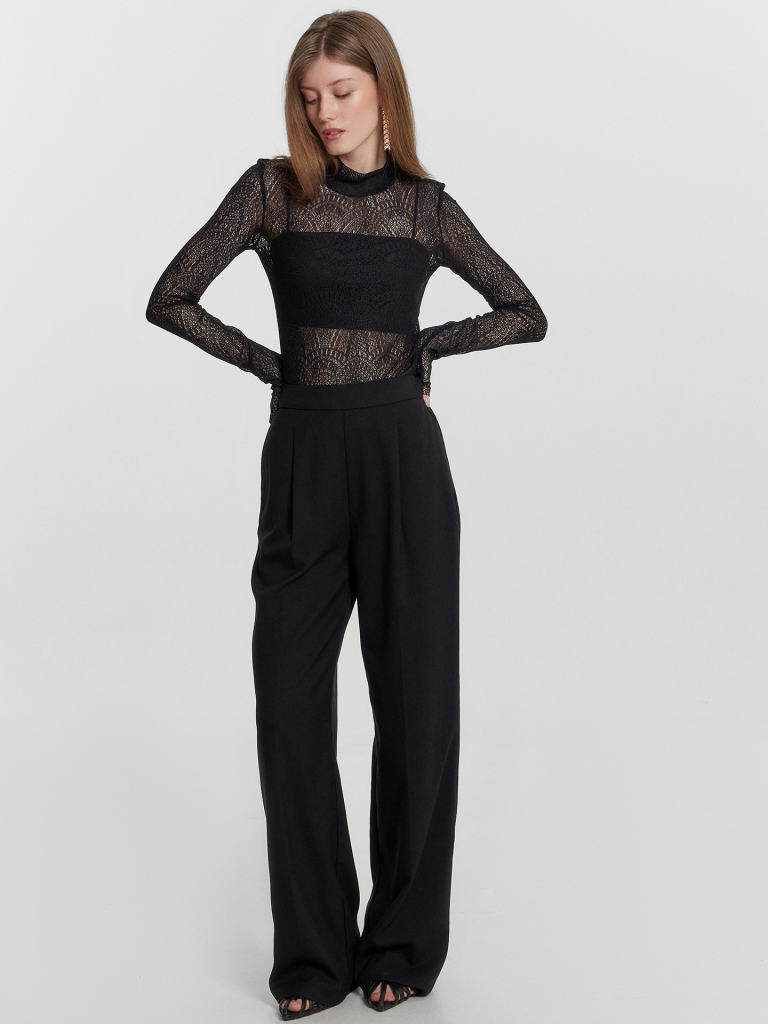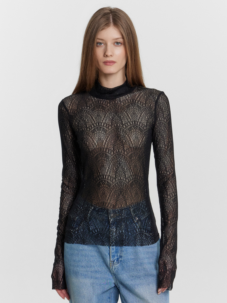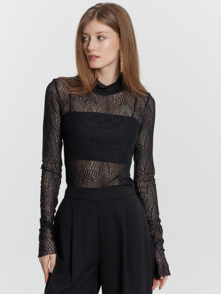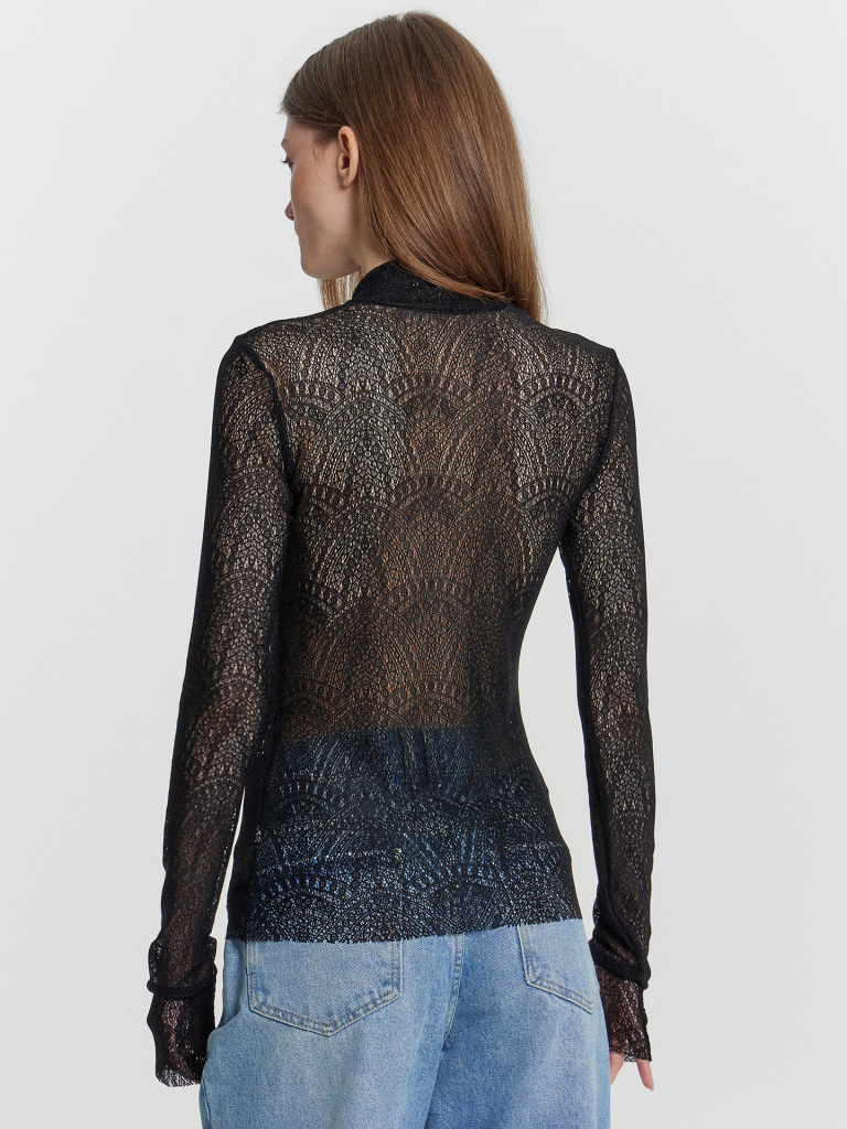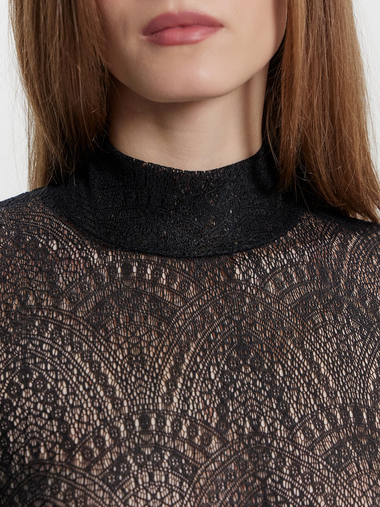 Джемпер женский прилегающего силуэта из трикотажного полотна сетка. Горловина круглой формы, с воротником стойкой. Рукав втачной длинный. Джемпер полной длины. Низ джемпера и рукавов сырой срез.