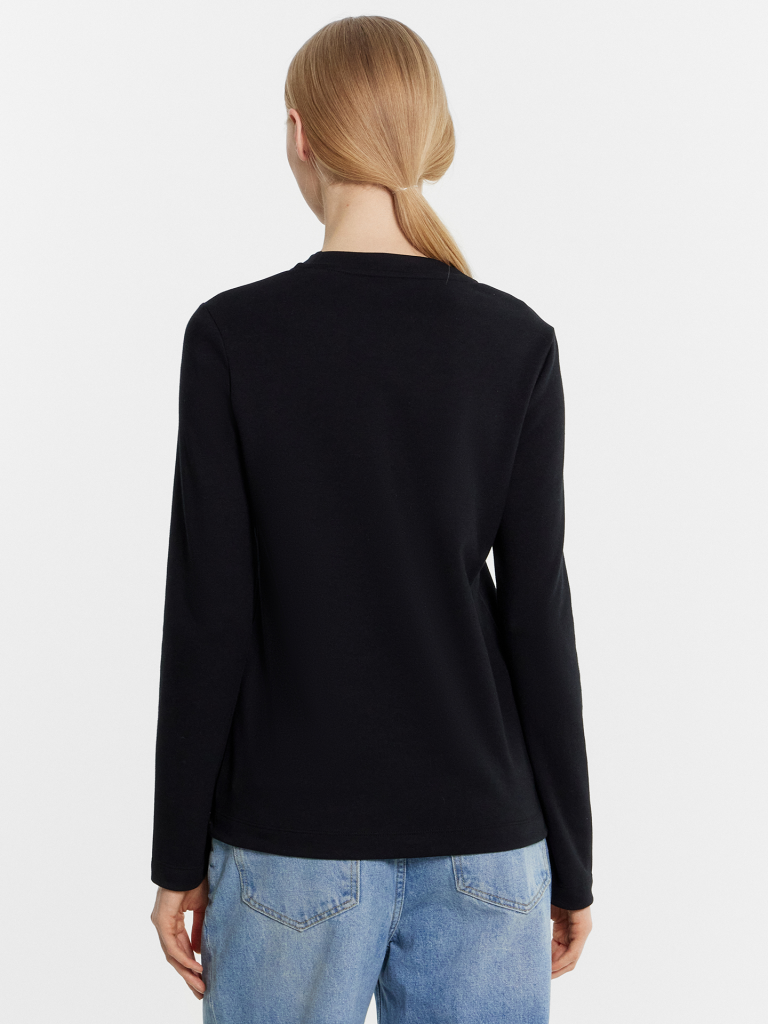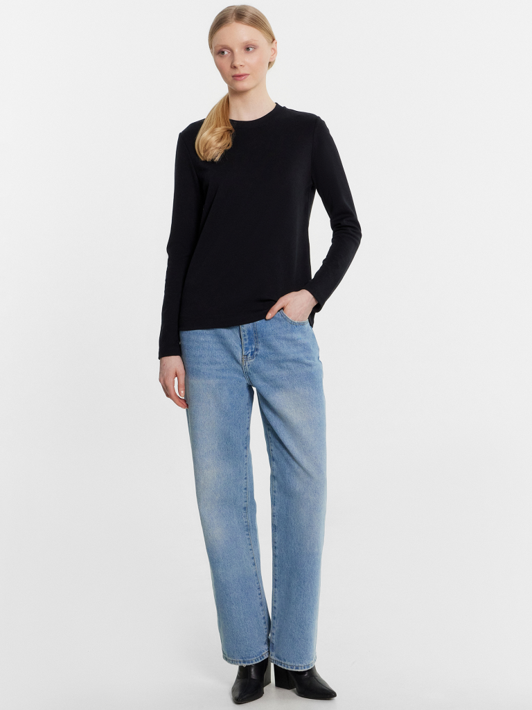 Джемпер женский прямого силуэта из трикотажного полотна кулирка. Горловина круглой формы, широкая обтачка из рибаны. Рукав втачной, длинный. Подгибки низа и рукава широкие.