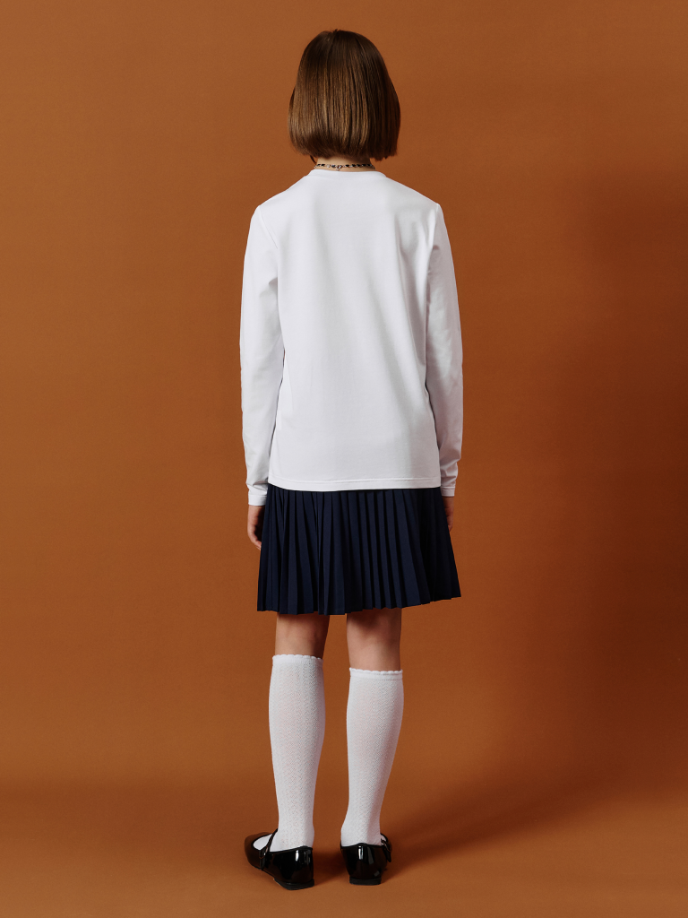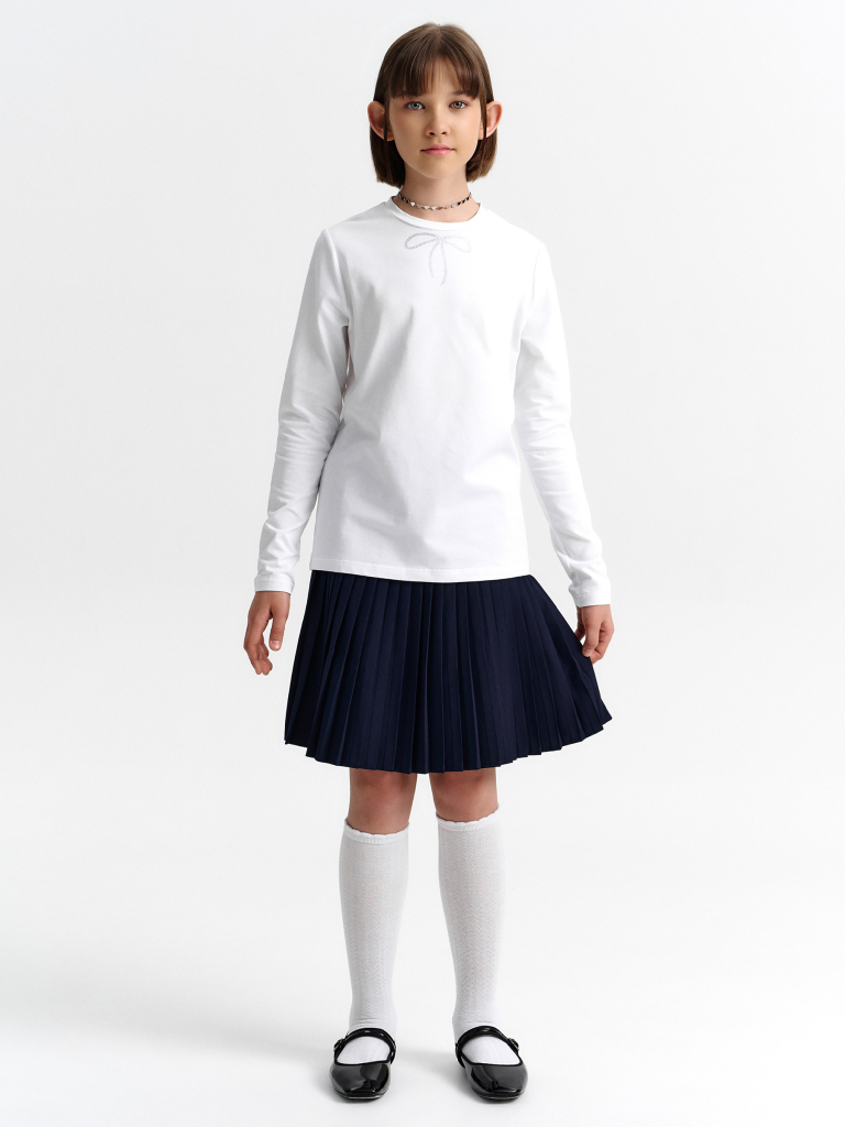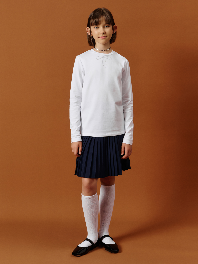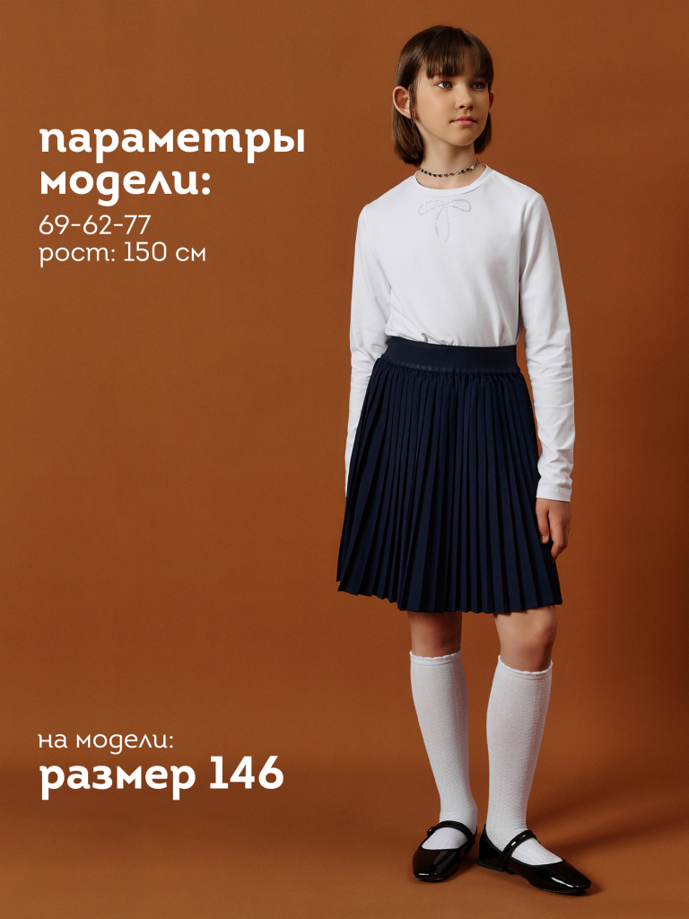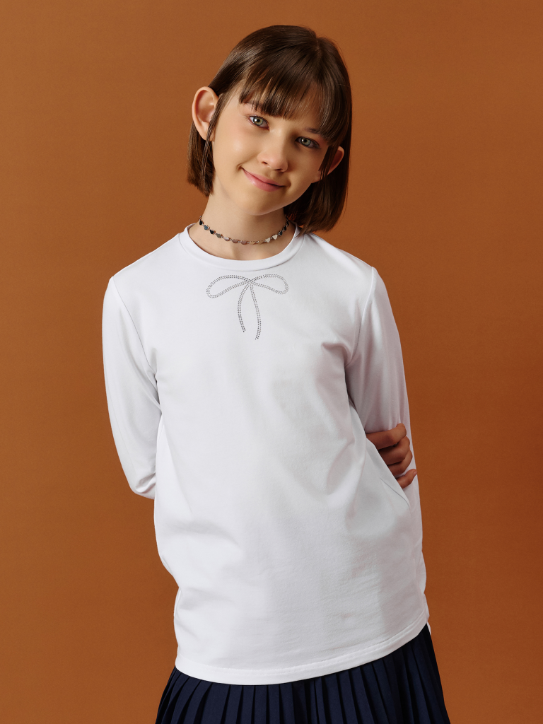 Идеальный выбор для школы и повседневной носки! Базовый джемпер прямого кроя с длинным рукавом выполнен из мягкого, эластичного трикотажа — ткань приятна к телу, не сковывает движения и хорошо держит форму. Благодаря продуманному крою и аккуратной посадке, джемпер комфортно сидит даже при активной активности в течение дня. Детали дизайна: Элегантный пайпинг по горловине придаёт аккуратный и законченный вид. На передней части — нежная аппликация из сверкающих страз: ненавязчивый, но стильный акцент, который понравится любой девочке. Почему это удобно: Материал не требует сложного ухода — легко стирается, быстро сохнет и не теряет цвет. Универсальная модель: подходит под школьную форму, джинсы, юбки и даже под сарафан. Подойдёт как для уроков, так и для прогулок после школы. Джемпер станет любимой вещью в гардеробе вашей дочки — практичный, красивый и удобный. Используйте таблицу размеров на фотографии, чтобы выбрать подходящий размер. Обратите внимание, что цвет товара на экране вашего устройства может отличаться от реального.