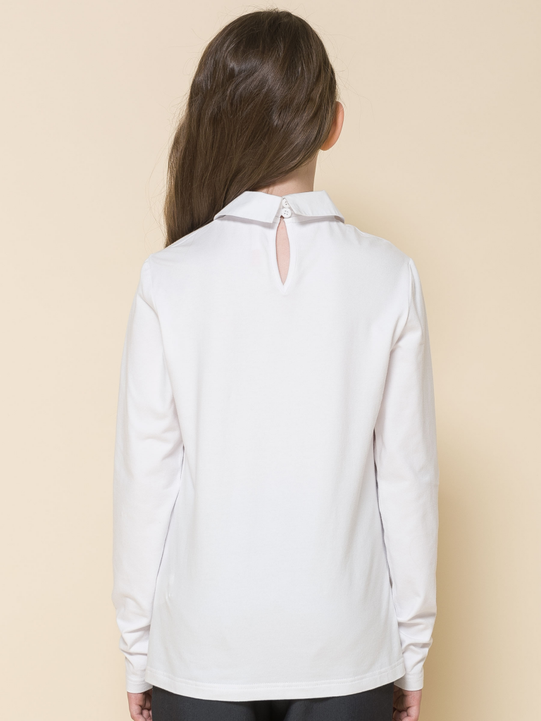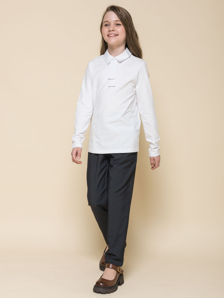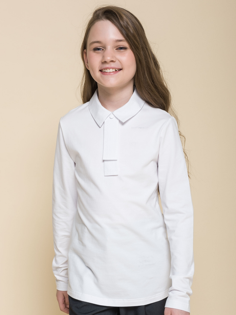 Школьный трикотажный джемпер прилегающего силуэта для девочки. В составе ткани преобладает хлопок — изделие мягкое, дышащее и приятное на ощупь. Эластан помогает сохранять форму и после многочисленных стирок. В джемпере комфортно в течение всего дня, ничего не давит, не колет, не сковывает движения. Блузку украшают белый воротничок и декоративно сложенный галстук из швейной ткани с пуговицей в тон — изюминка этой модели. Он позволяет создавать элегантные образы с пиджаком, жилетом, сарафаном. Модель застёгивается сзади на пуговицу с петлёй из резинки — ребёнку удобно её застёгивать и расстёгивать. Универсальный вариант школьной одежды — подойдёт как для повседневной носки, так и для более торжественного случая.