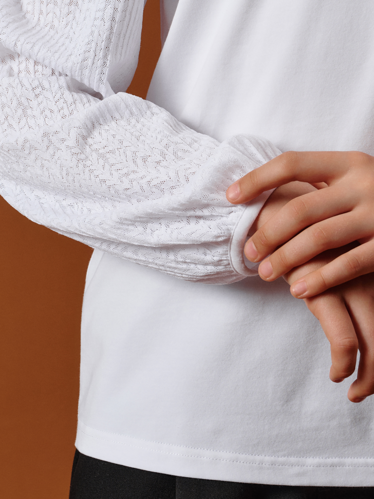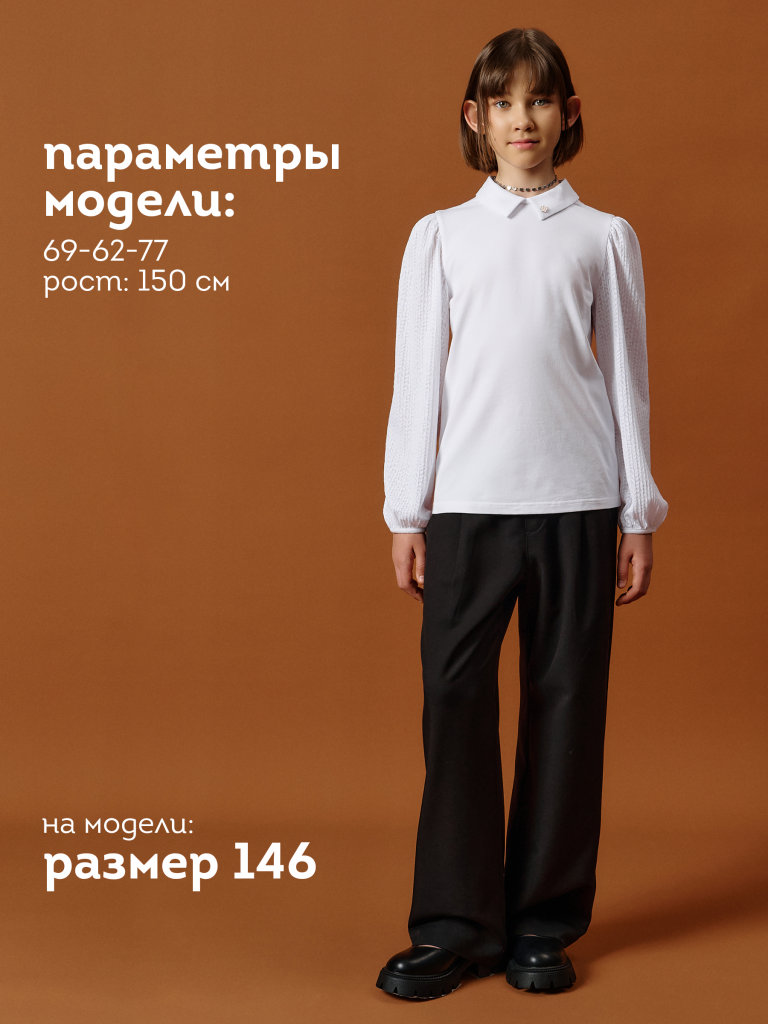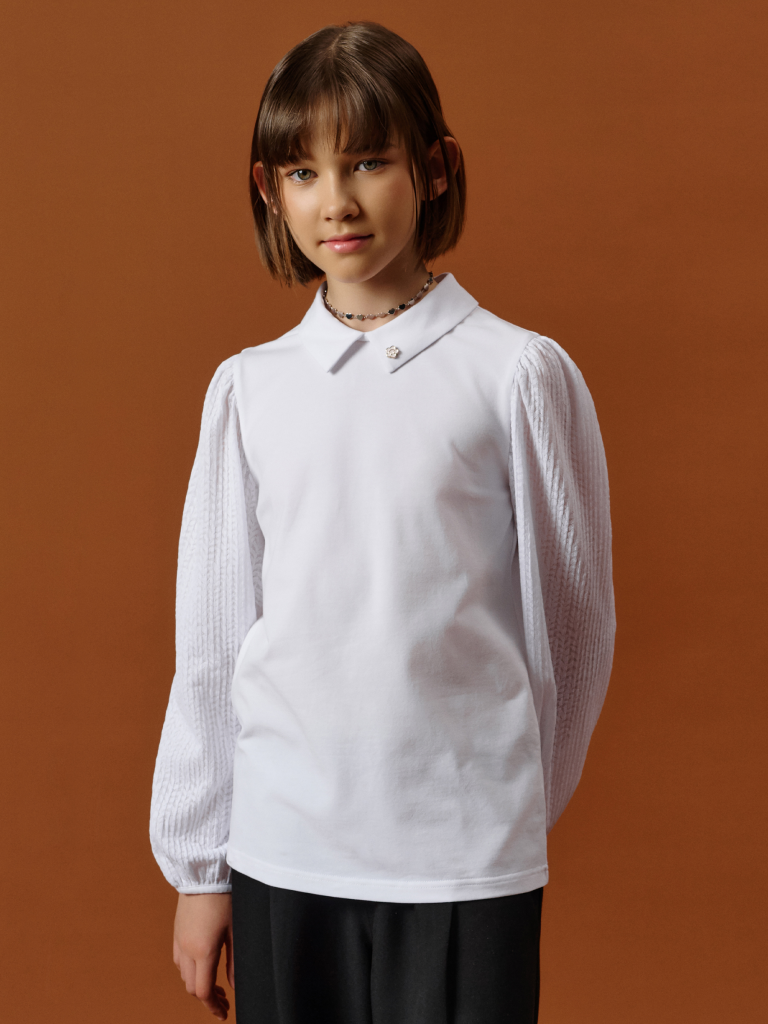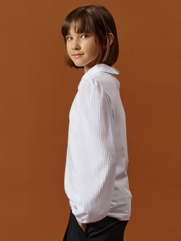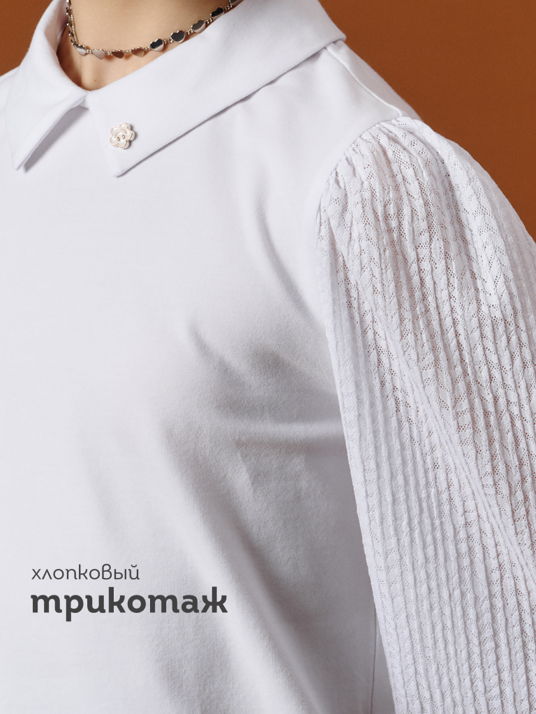 Школьная блузка для девочки с кружевными рукавами, воротником и съёмным пином — комфорт и стиль на каждый день Эта трикотажная блузка для школы сочетает в себе удобство, аккуратный внешний вид и оригинальные детали. Модель выполнена из мягкого хлопкового материала с добавлением эластана — ткань дышит, приятно ощущается на теле и не сковывает движений. Полуприлегающий силуэт и эластичная структура делают блузку комфортной для повседневной носки в школе. Длинные кружевные рукава с гофрированным эффектом придают образу лёгкость и индивидуальность. Сборка по верху и низу добавляет объёма, а аккуратная отделка манжет тканью в тон делает рукава удобными и не раздражающими кожу. Отложной воротничок добавляет строгости и хорошо смотрится под сарафан, пиджак или жилет. Сзади — разрез и застёжка на две пуговицы с мягкими резиновыми петельками — легко надевать и снимать, особенно для младших школьниц. Изюминка модели — съёмный пин в виде весёлого цветочка с глазками и улыбкой. Он добавляет игривое настроение и делает образ менее формальным. Такой аксессуар понравится детям, ведь его можно снять или прикрепить по настроению. Это делает блузку не только школьной, но и подходящей для прогулок, походов в кружки или встреч с друзьями. Идеальна для 1–9 классов, подходит к любой школьной форме: юбкам, брюкам, сарафанам. Используйте таблицу размеров на фотографии, чтобы выбрать подходящий размер. Обратите внимание, что цвет товара на экране вашего устройства может отличаться от реального.