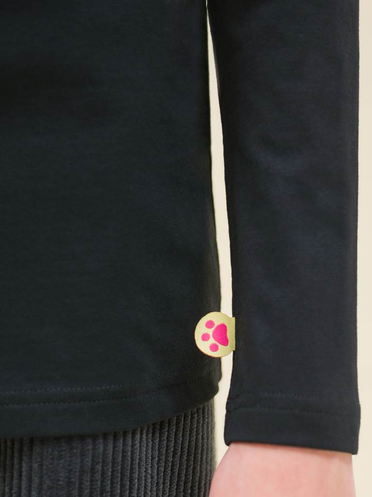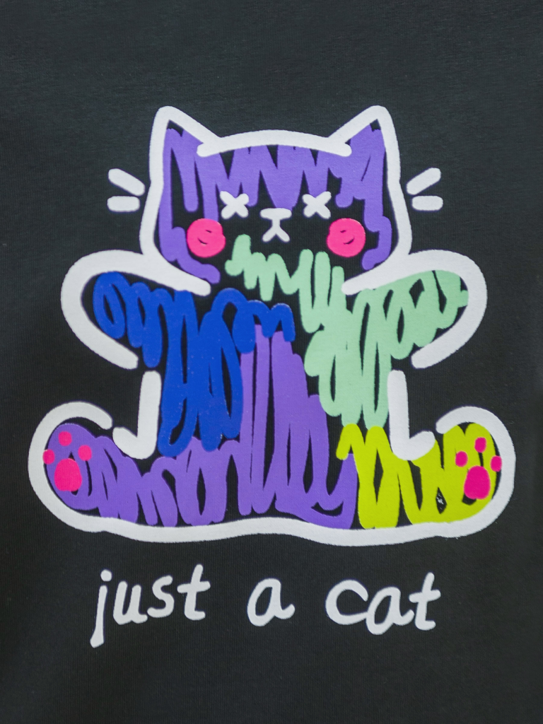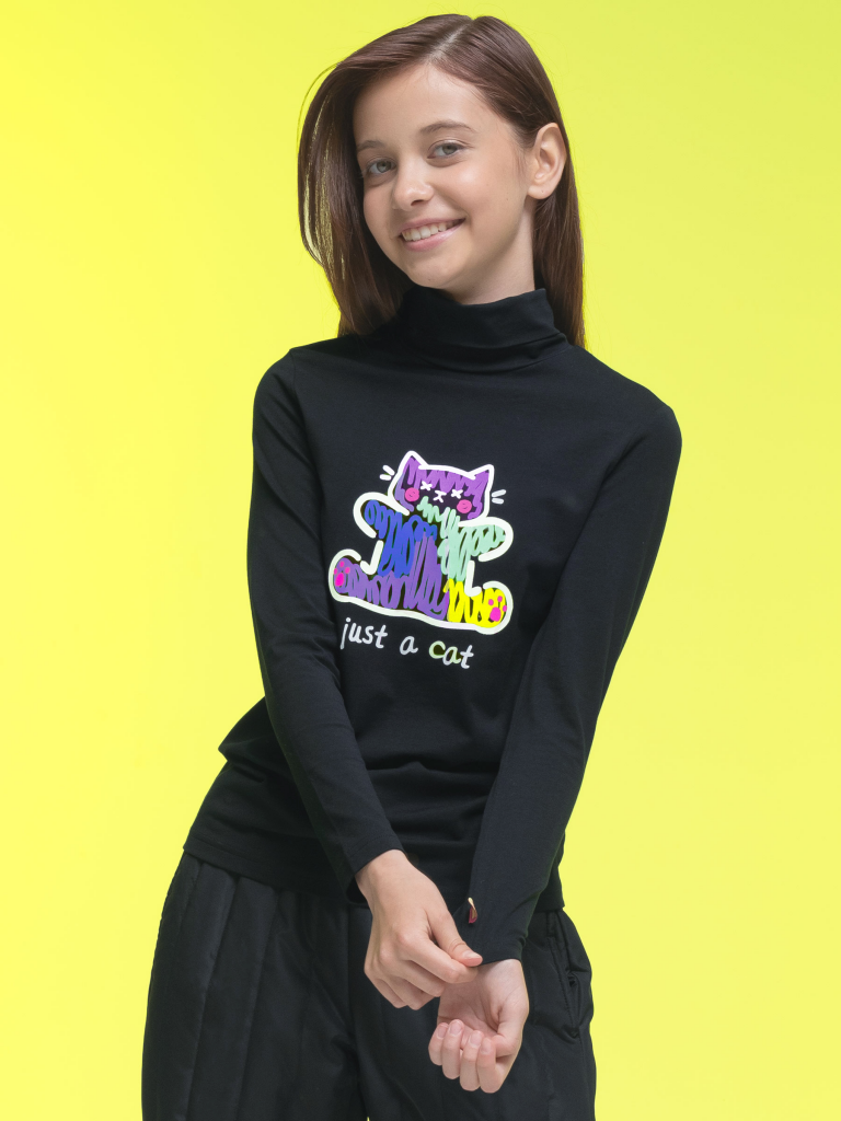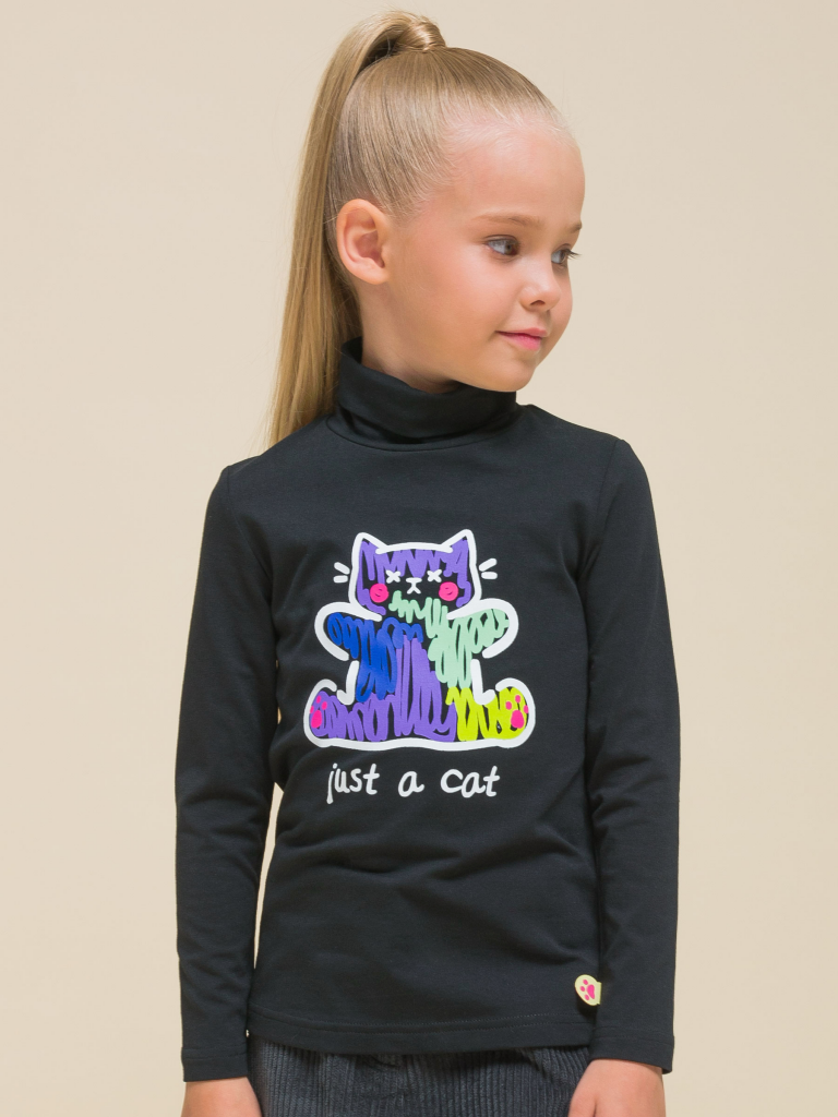 Водолазка детская для девочки. Лонгслив модного свободного силуэта подарит ребёнку комфорт и свободу движений. Водолазка с длинным рукавом дополнена воротником-стойкой, который защищает шею от холода и ветра — нет необходимости дополнительно надевать шарф. Модель неприхотлива в уходе. В составе ткани пребладает высококачественный хлопок — джемпер мягкий и отлично пропускает воздух, давая коже ребёнка дышать. Эластан помогает изделию сохранить прекрасную форму надолго. Водолазка с принтом по переду. Принт эластичный и стойкий, великолепно переносит многочисленные стирки. На принте изображён котик, надпись переводится «просто кот». В шве левого рукава вшита декоративная деталь - лапка котенка. Порадует любую девочку. Джемпер с воротником выполнен в классическом чёрном цвете, его легко сочетать с любыми брюками, джинсами, легинсами, юбками. Размерный ряд: 2 (92): 3 (98): 4 (104): 5 (110): 6 (116), 7 (122): 8 (128): 9 (134): 10 (140): 11 (146). Водолазка с горлом станет отличным дополнением гардероба для маленьких девочек дошкольного и младшего школьного возраста, а также девочек-подростков. Его можно носить в детский сад, на прогулки, отдых, а также дома. Водолазка подходит для круглогодичного применения: летом, осенью, зимой, весной и демисезон. Отличный подарок дочери, внучке или сестре на Новый год и любой другой праздник.