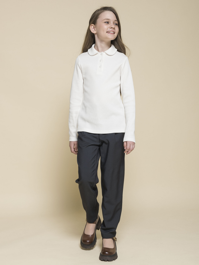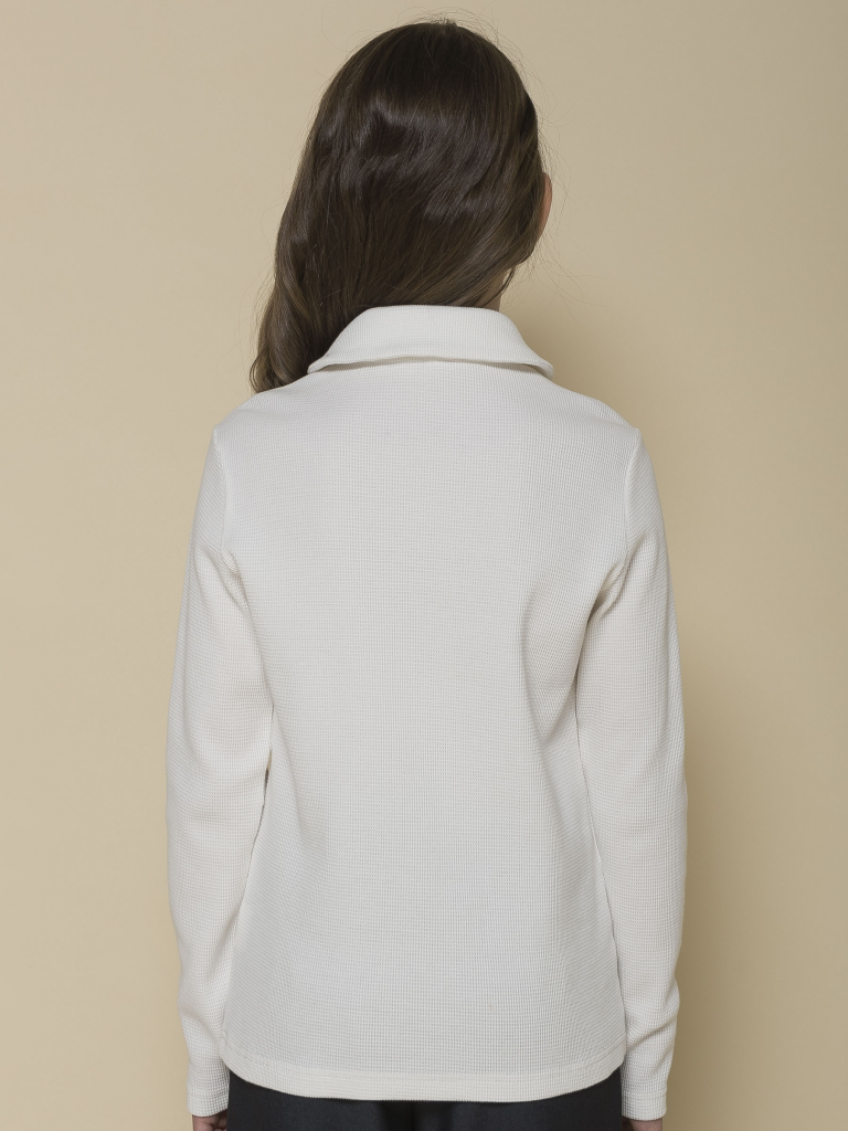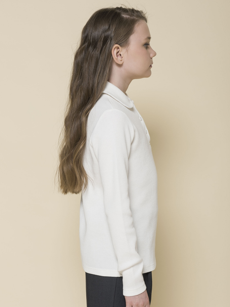Трикотажный джемпер прилегающего силуэта для девочки. Приятный на ощупь, с большим содержанием хлопка в составе, гигроскопичный и простой в уходе вафельный трикотаж. В джемпере комфортно в течение всего дня, ничего не давит, не колет, не сковывает движения. Модель с аккуратным отложным воротничком со скруглёнными концами застёгивается по центру на три пуговицы — ребёнку удобно надевать и снимать джемпер через голову. Пуговицы тон в тон с матовым покрытием софт-тач — тактильно приятные и добавляют модели элегантности. Лаконичный дизайн лонгслива позволяет сочетать его с различными моделями школьной формы: юбками, брюками, сарафанами. Модный и практичный вариант одежды для школы.