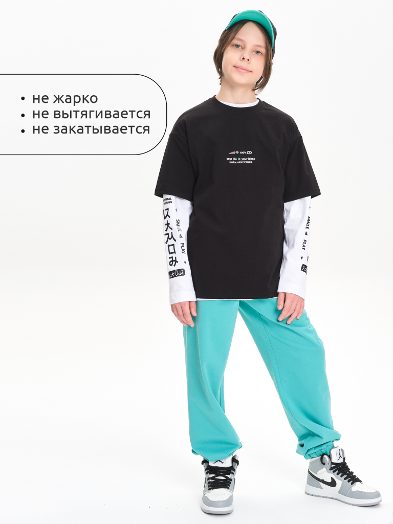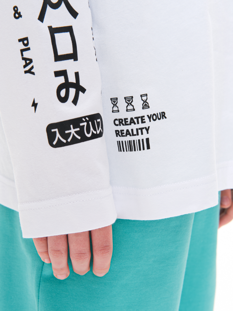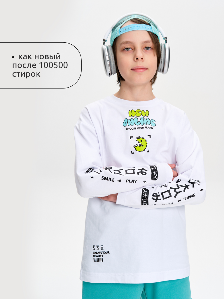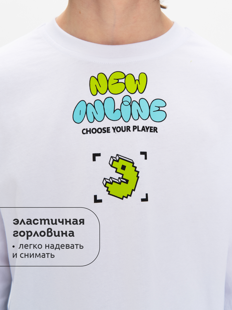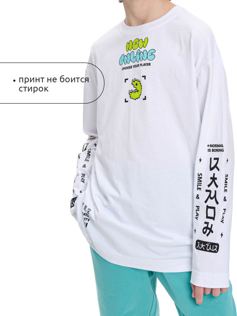 Лонгслив для мальчика. Джемпер свободного силуэта со спущенным плечом. Футболка с длинным рукавом выполнена в стиле Digital. Горловина обработана эластичной рибаной - голова не застрянет. Водолазка без горловины украшена молодежным ретро-принтом Pac-man (пакмен), который немпременно оценят юные геймеры. Кроме принта по переду изделия есть надписи, перевод надписей: "new online" - новый онлайн, "choose your player" - выбери своего игрока, "create your reality" - создавай свою реальность. Рукава также украшены принтом-надписью в японском стиле, он эластичный и прочный, без проблем переносит частые стирки. Перевод надписей на рукавах: "камон, normal is boring" - камон, нормальное это скучно, "smile and play" - улыбайся и играй. Тонкая кофта в стиле аниме подойдет для малышей и подростков. Прекрасный выбор для детского сада, спортивных тренировок, для отдыха дома. Изделие можно носить весной, летом, осень и зимой.