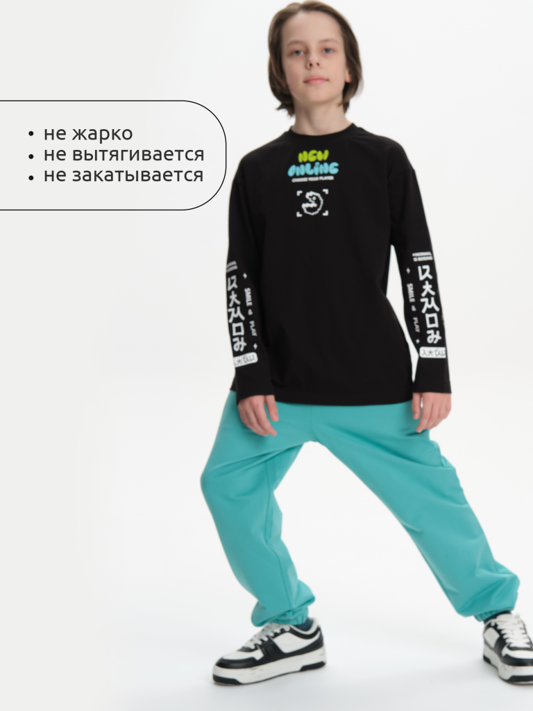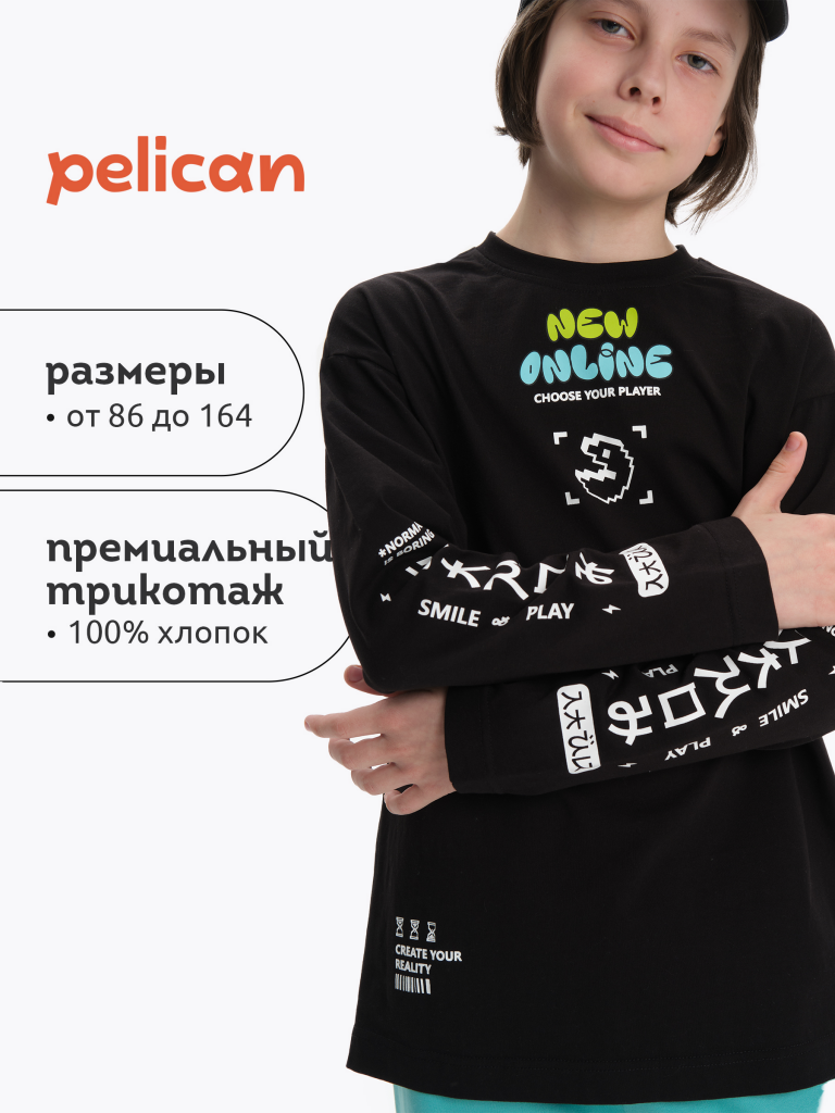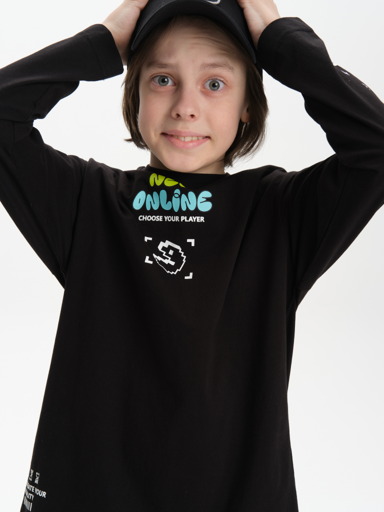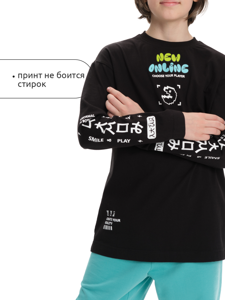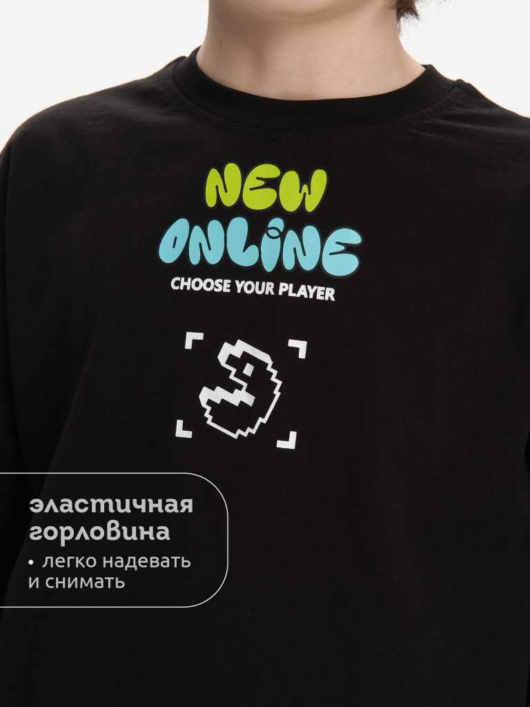 Лонгслив для мальчика. Джемпер свободного силуэта со спущенным плечом. Футболка с длинным рукавом выполнена в стиле Digital. Горловина обработана эластичной рибаной - голова не застрянет. Водолазка без горловины украшена молодежным ретро-принтом Pac-man (пакмен), который немпременно оценят юные геймеры. Кроме принта по переду изделия есть надписи, перевод надписей: "new online" - новый онлайн, "choose your player" - выбери своего игрока, "create your reality" - создавай свою реальность. Рукава также украшены принтом-надписью в японском стиле, он эластичный и прочный, без проблем переносит частые стирки. Перевод надписей на рукавах: "камон, normal is boring" - камон, нормальное это скучно, "smile and play" - улыбайся и играй. Тонкая кофта в стиле аниме подойдет для малышей и подростков. Прекрасный выбор для детского сада, спортивных тренировок, для отдыха дома. Изделие можно носить весной, летом, осень и зимой.
