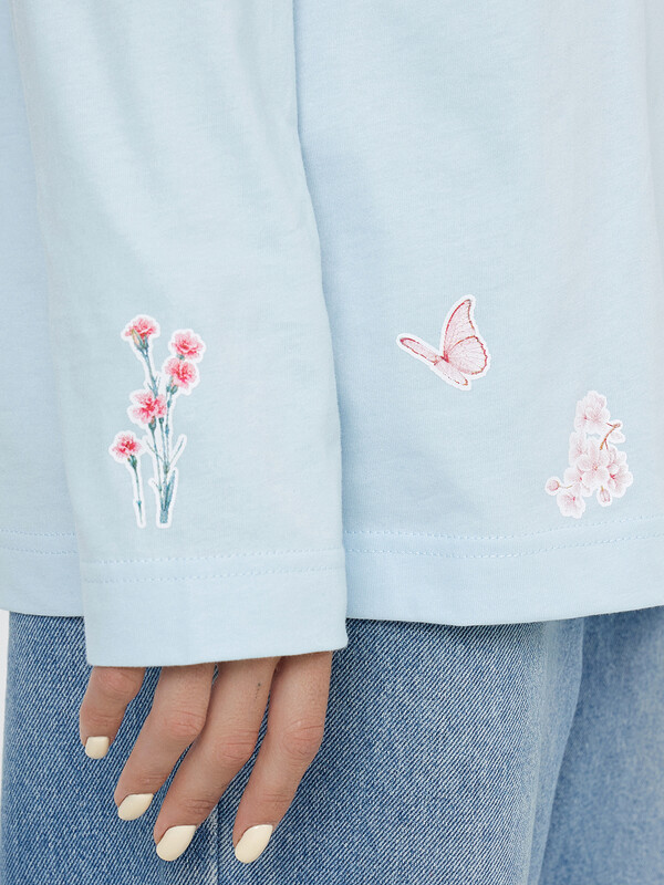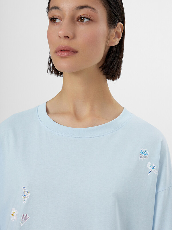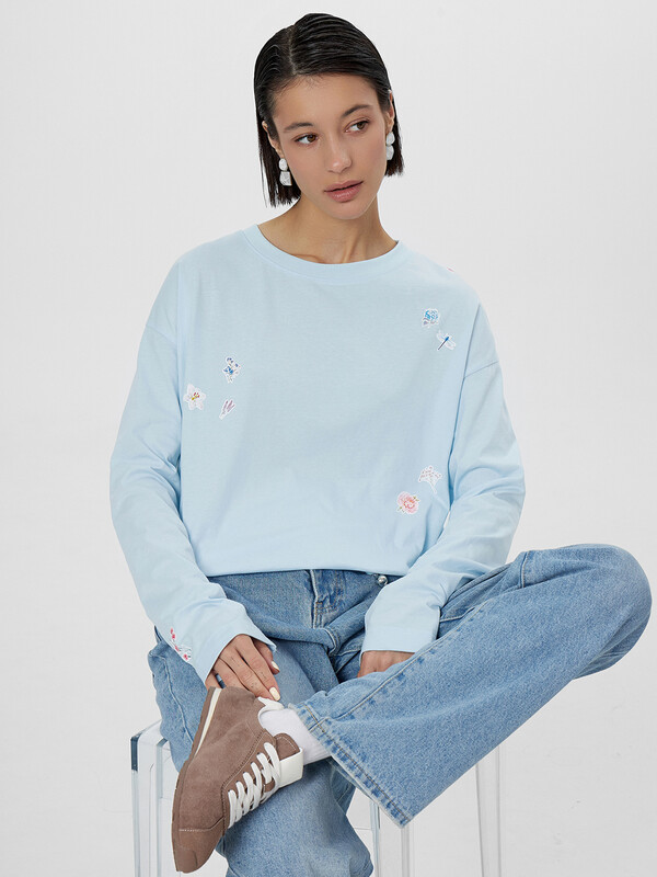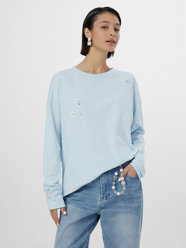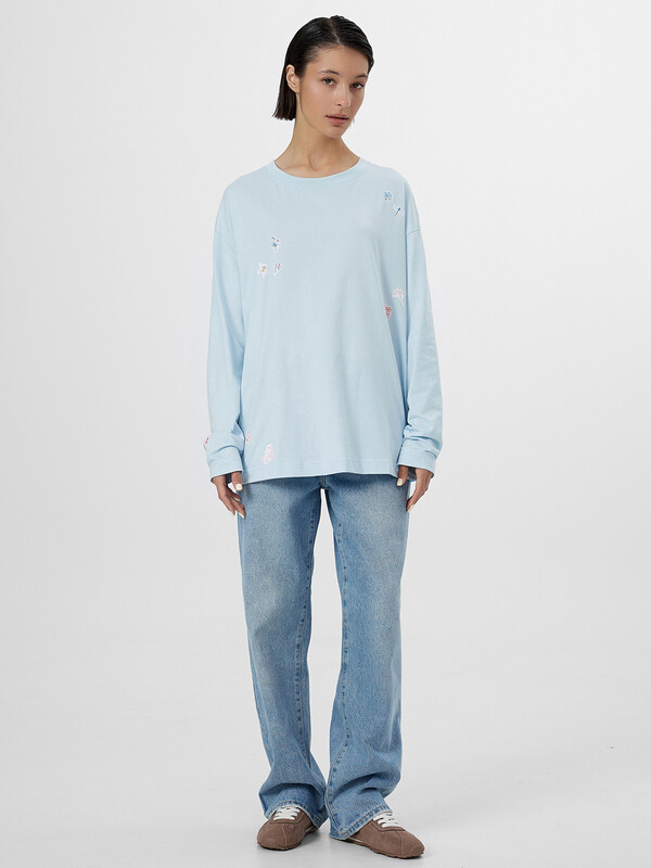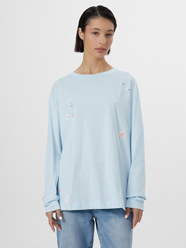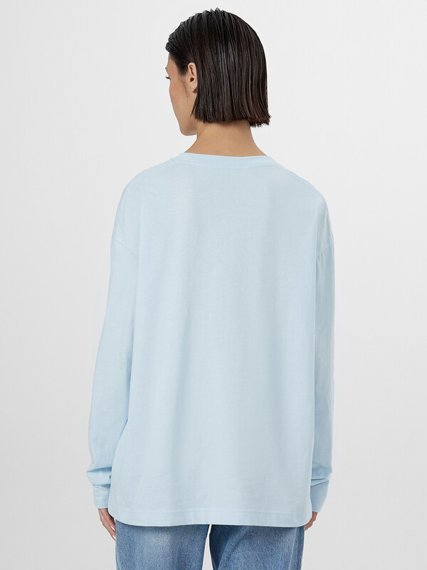 Базовый лонгслив женский свободного силуэта из трикотажного полотна кулирка. Горловина круглой формы, обтачка из рибаны. Бейка окантовки спинки настрачивается от плеча до плеча.