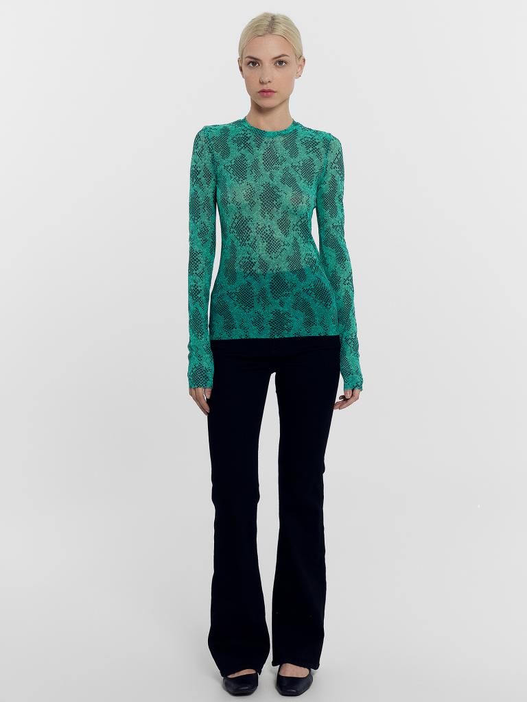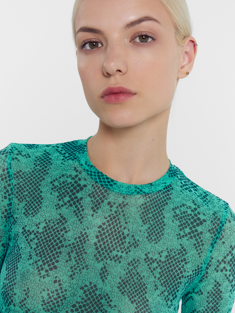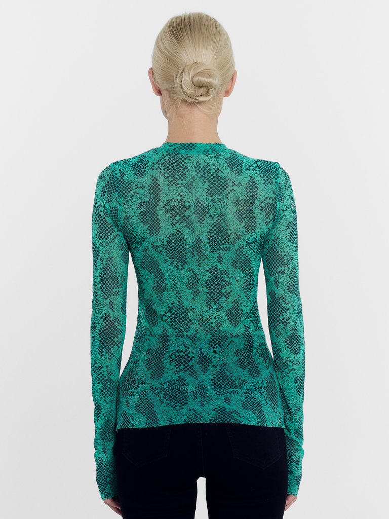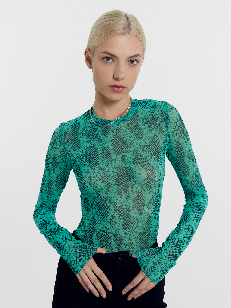 Стильный женский лонгслив (джемпер) с принтом из высококачественного эластичного сетчатого материала. Модель облегающего силуэта длиной до середины линии бедер. Горловина округлой формы. Рукава втачные длинные, имеют сырой срез, как и низ лонга. Легкий и полупрозрачный, позволит собрать оригинальный аутфит на прогулку, встречу с друзьями или свидание. Легко комбинируется с другими вещами в женском гардеробе. Дополнить можно низом на свой вкус. Рекомендуем для создания эффектных образов!