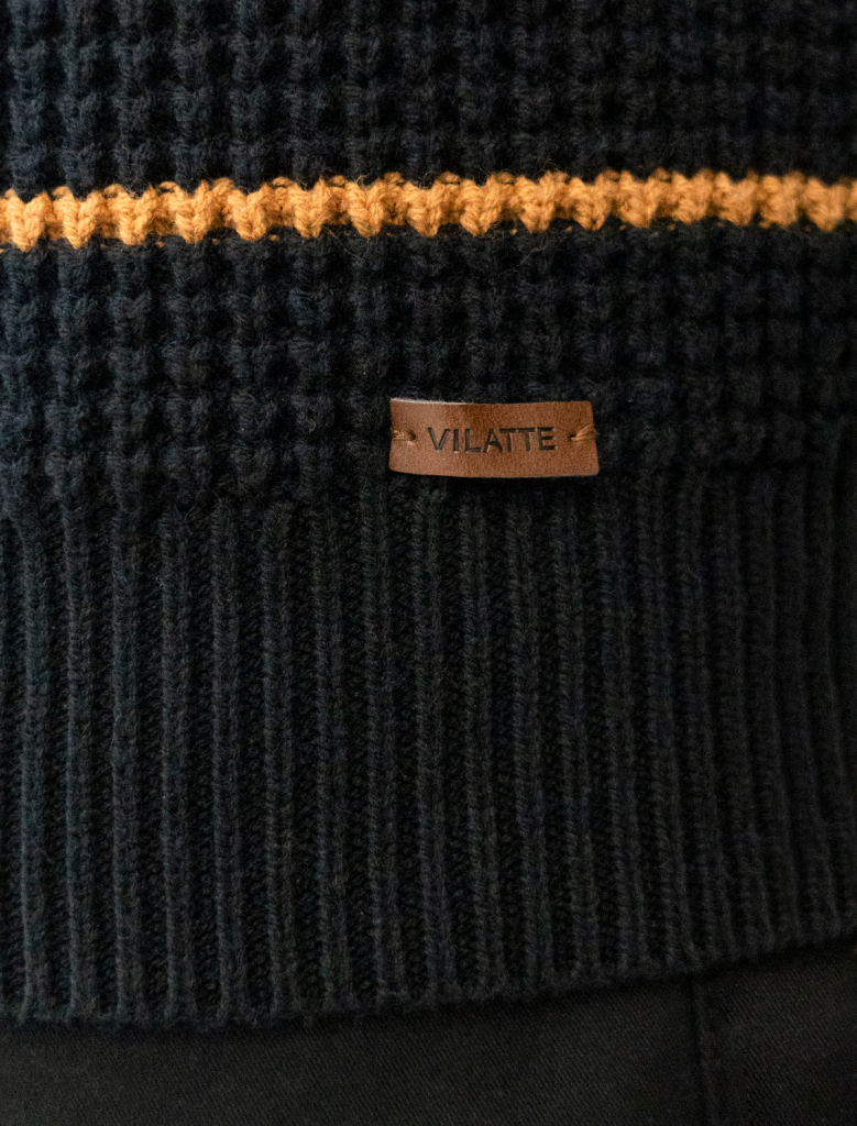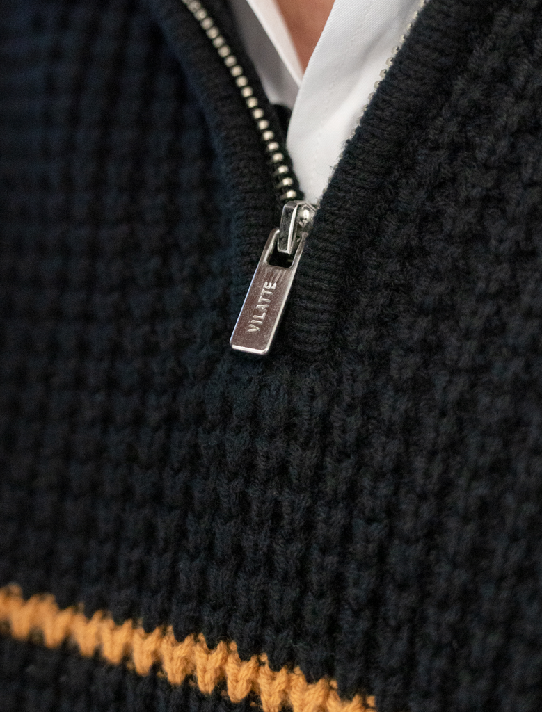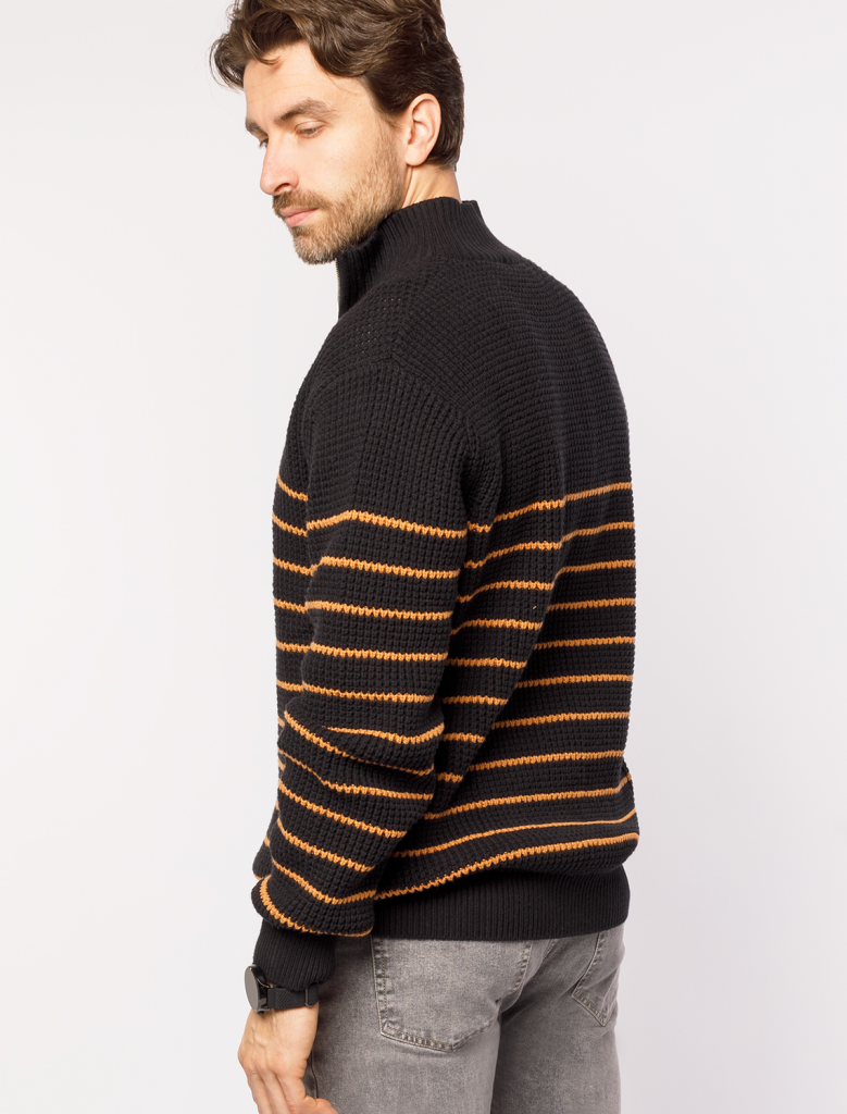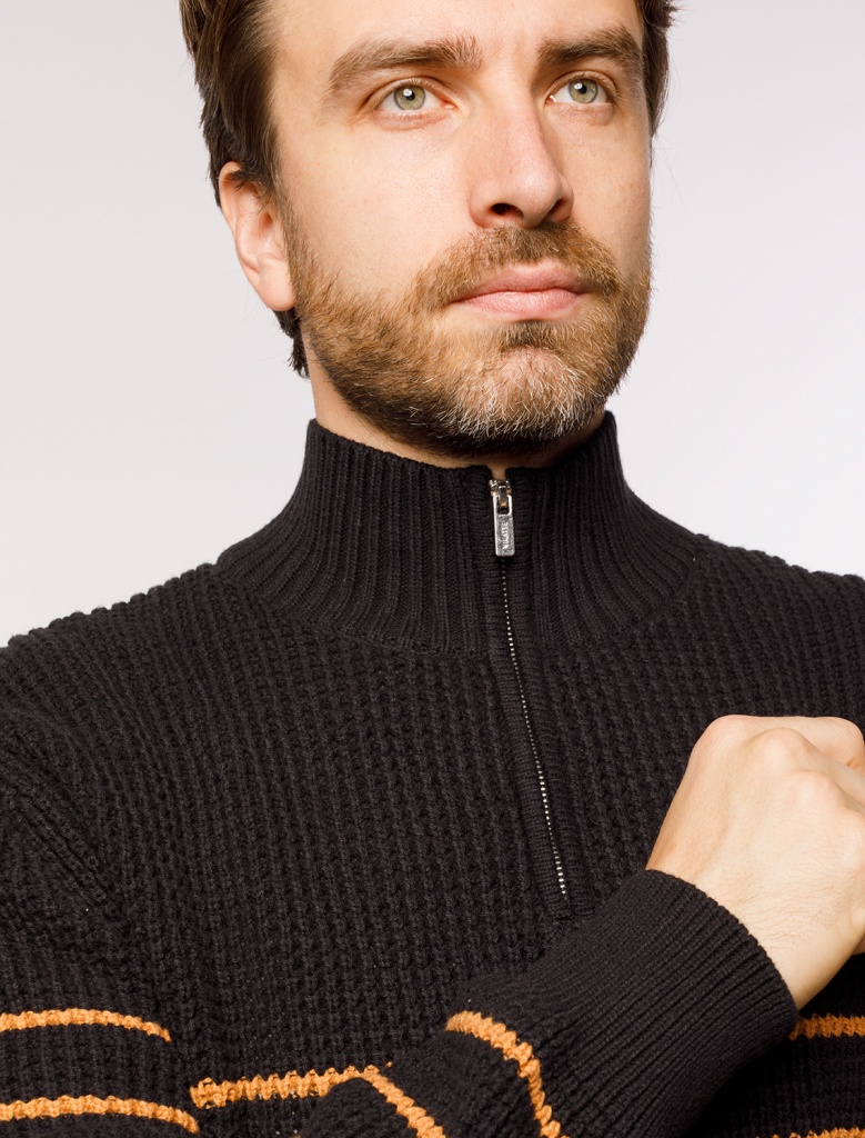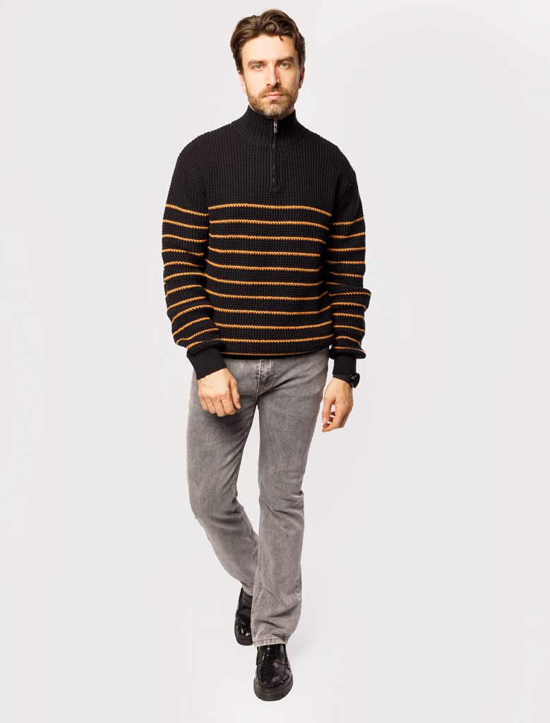 Свитер с узором полосы выполнен из хлопковой пряжи с добавлением акрила. Теплая модель фактурной крупной вязки с воротом, застегивается металлической молнией. Регулируя ворот можно носить с рубашками, футболками и водолазками. Кроме того, свитер совершенно не колется, поэтому его комфортно носить даже на голое тело. Внизу изделия нашивка бренда из эко-кожи.