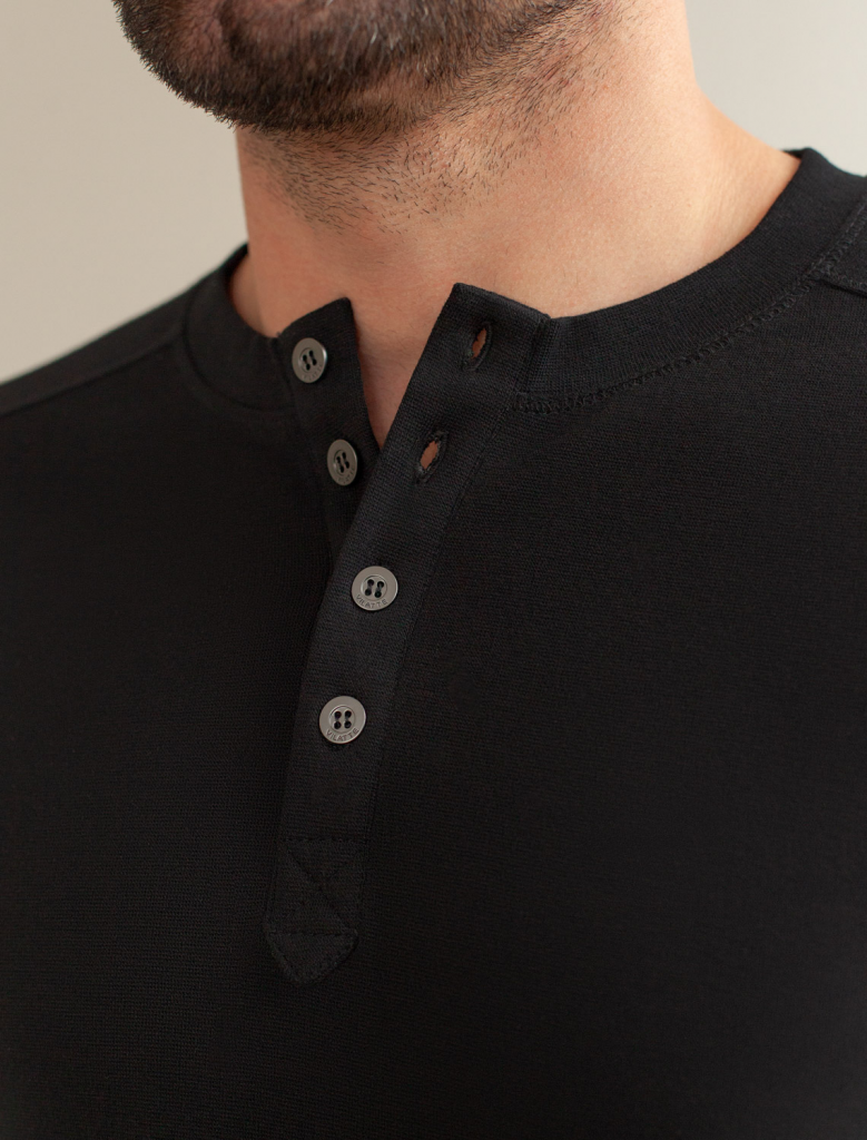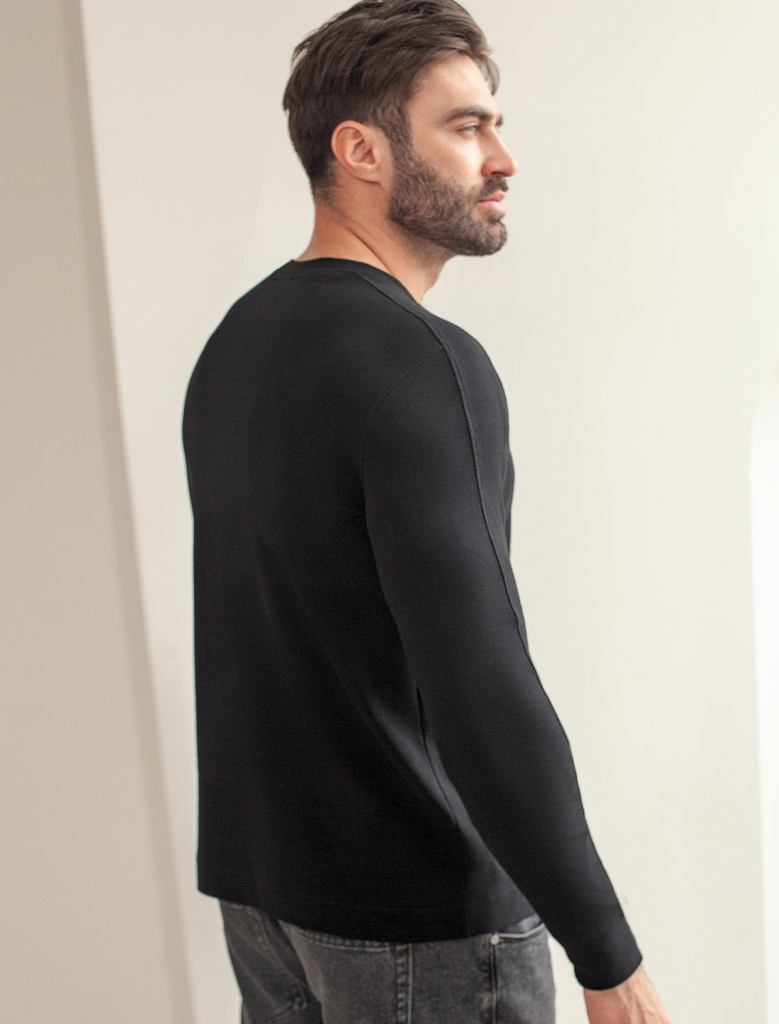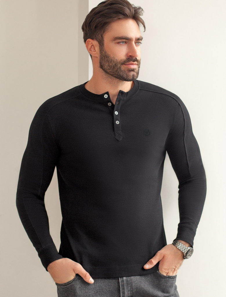 Лонгслив черного цвета выполнен из премиального хлопка с эластаном и идеально подходит для повседневной носки. Круглый ворот с застежкой на металлические пуговицы с логотипом бренда добавляет образу стильный акцент, делая этот лонгслив универсальным выбором как для парней, так и для мужчин любого возраста. Декоративные швы на рукавах и минималистичная вышивка в виде эмблемы VILATTE придают лонгу современный вид и подчеркивают его уникальность. Эластичный хлопковый лонгслив полуприлегающего кроя идеально сидит по фигуре, подчеркивая достоинства телосложения, но не стесняет движений. Натуральный материал этой футболки с длинным рукавом обеспечивает легкость и комфорт даже в жаркое время года. Дышащая ткань способствует циркуляции воздуха, позволяя чувствовать себя удобно и уверенно на протяжении всего дня. Подходит для создания многослойных образов в холодное время года, а в межсезонье и теплые дни можно носить как самостоятельный элемент гардероба, легко комбинируется с повседневной и офисной одеждой в с