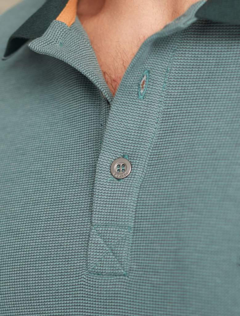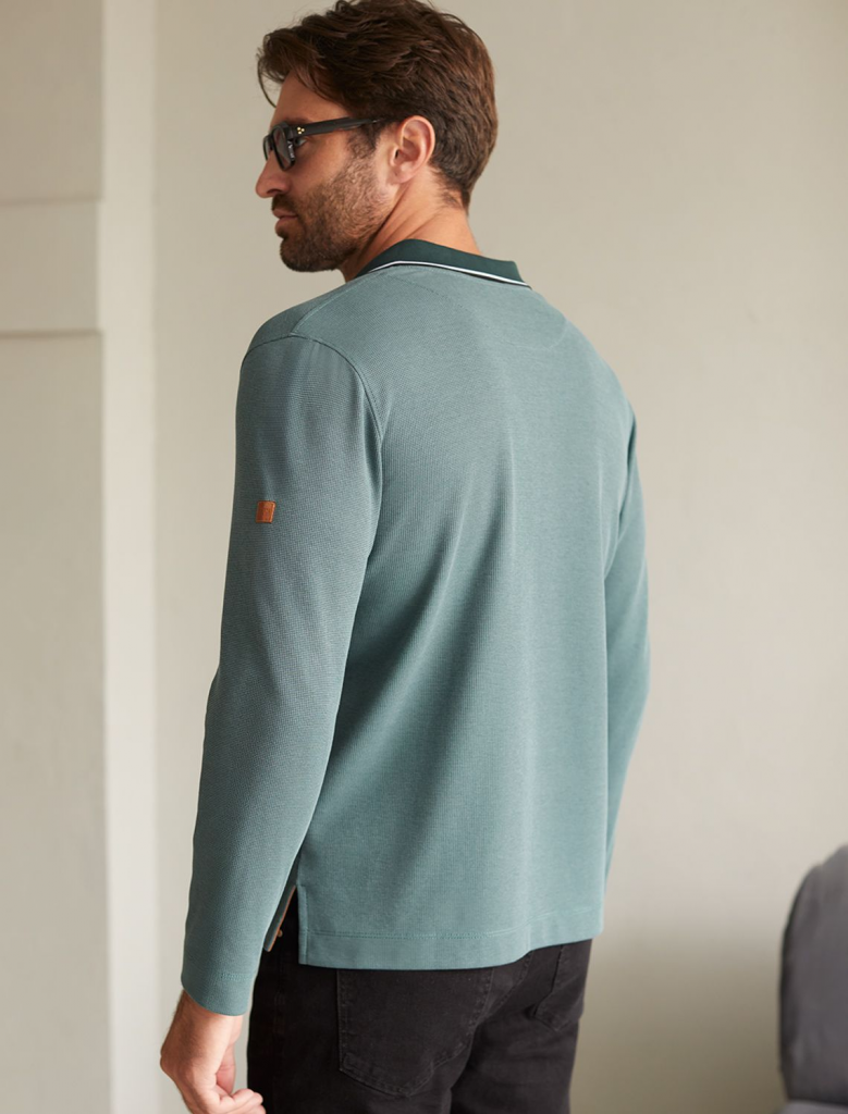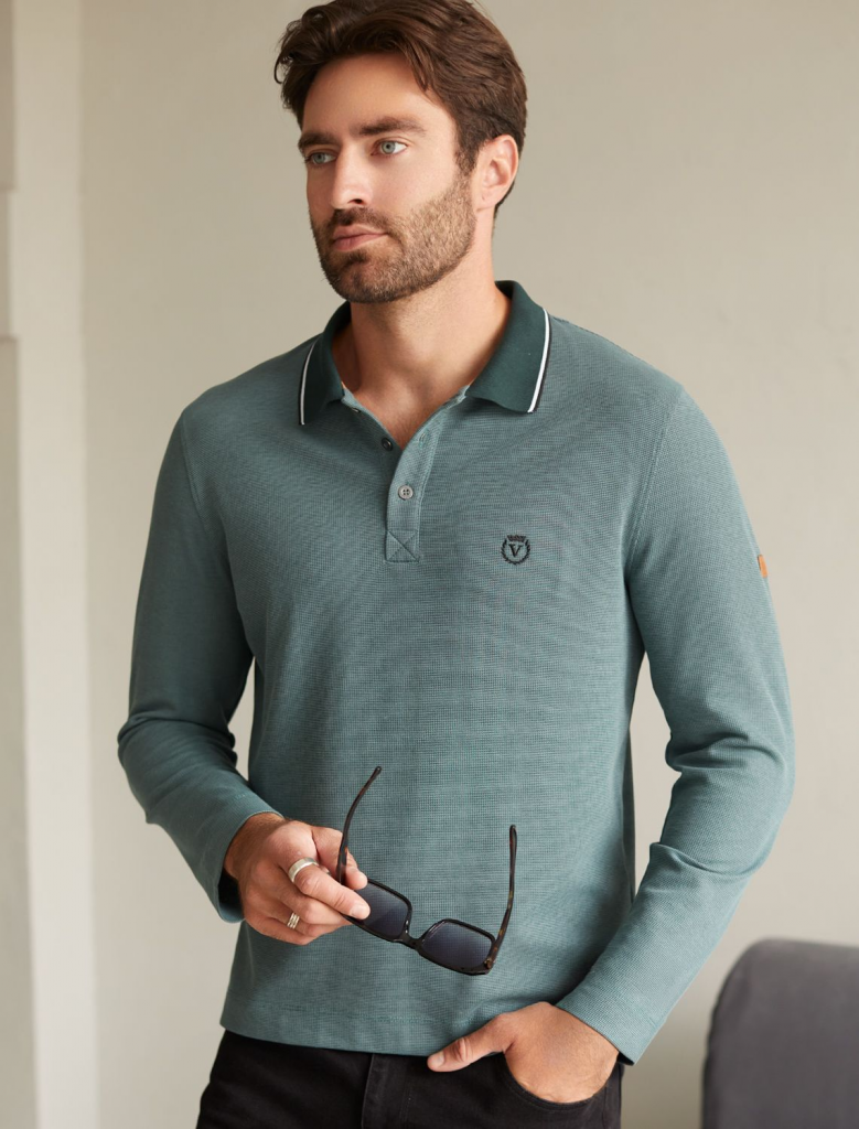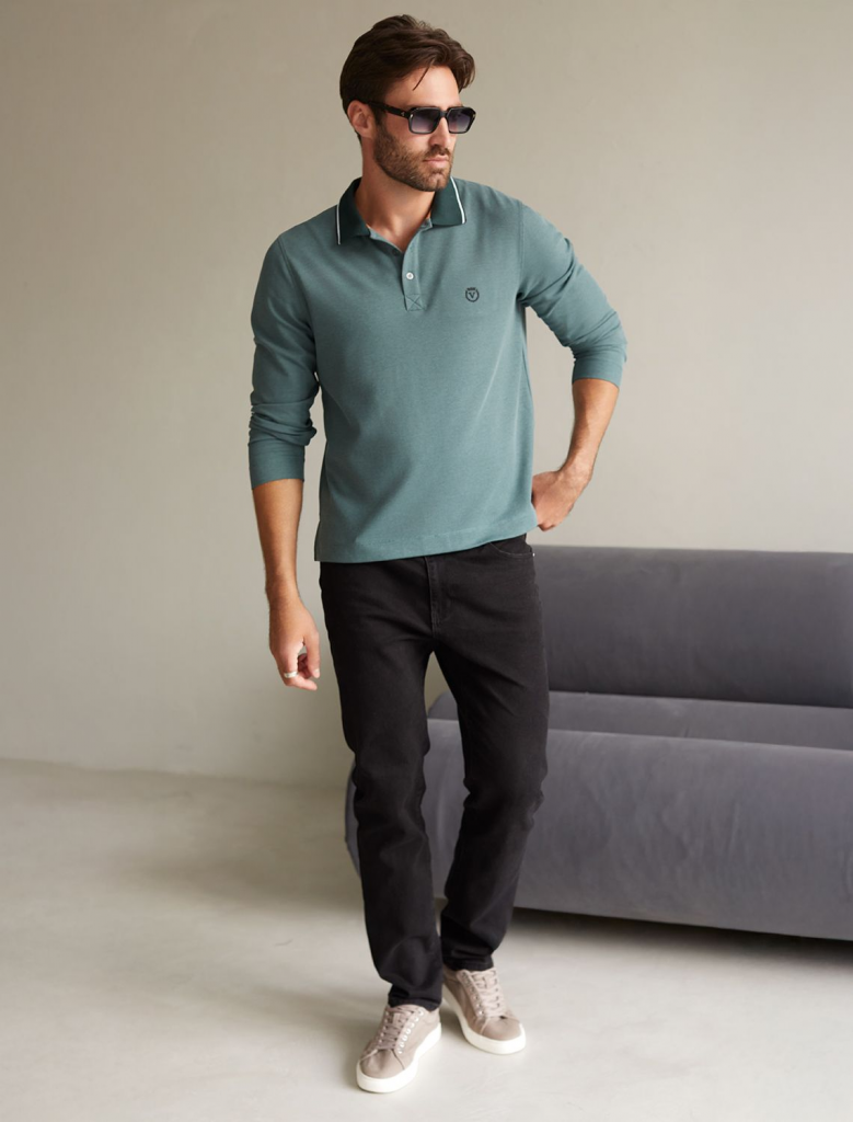 Стильный лонгслив не яркого изумрудного цвета с плетеным воротником поло с застежкой на пуговицы выполнен из премиального хлопка в сочетании с эластаном .Невероятно мягкая ткань из натуральных волокон - она едва ощутима на коже и словно обнимает тело. Материал при касании кажется бархатистым, при движении он словно повторяет все мельчайшие линии фигуры. По свойствам материал сочетает в себе практичность и нежность: отлично провускает воздух, сохраняя ощущение свежести в течение всего дня, при этом созраняет тепло в прохладную погоду.Идеально подходит для чувствительной кожи, не вызывает раздражения и дискомфорта. Удобный отложной воротник делает образ современным и стильным, а длинные рукава с манжетами защищают руки при ветреной погоде. Поло хорошо садится по фигуре благодаря добавлению эластичных волокон — такой вариант подходит для мужчин любого роста и размеров, не стесняет движений и создает ощущение свободы и легкости. Повседневный лонгслив дополнен ненавязчивой вышивкой на груди в виде логотипа бр