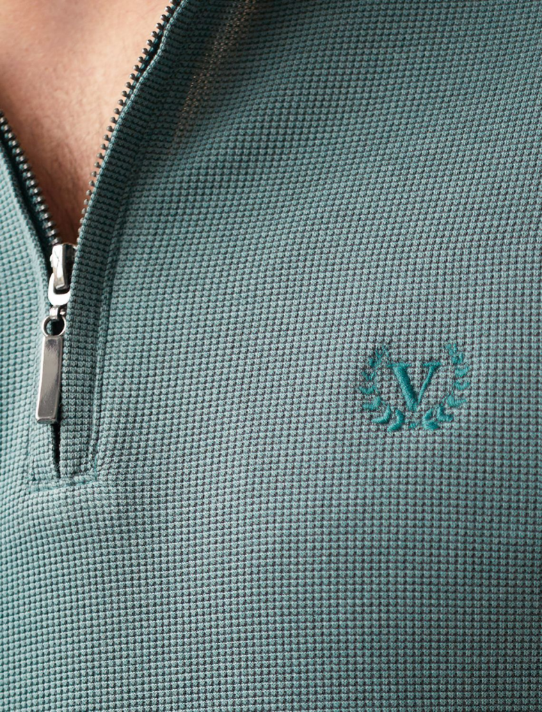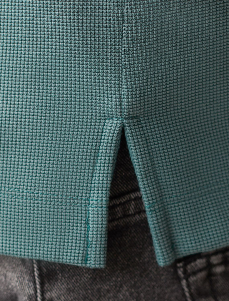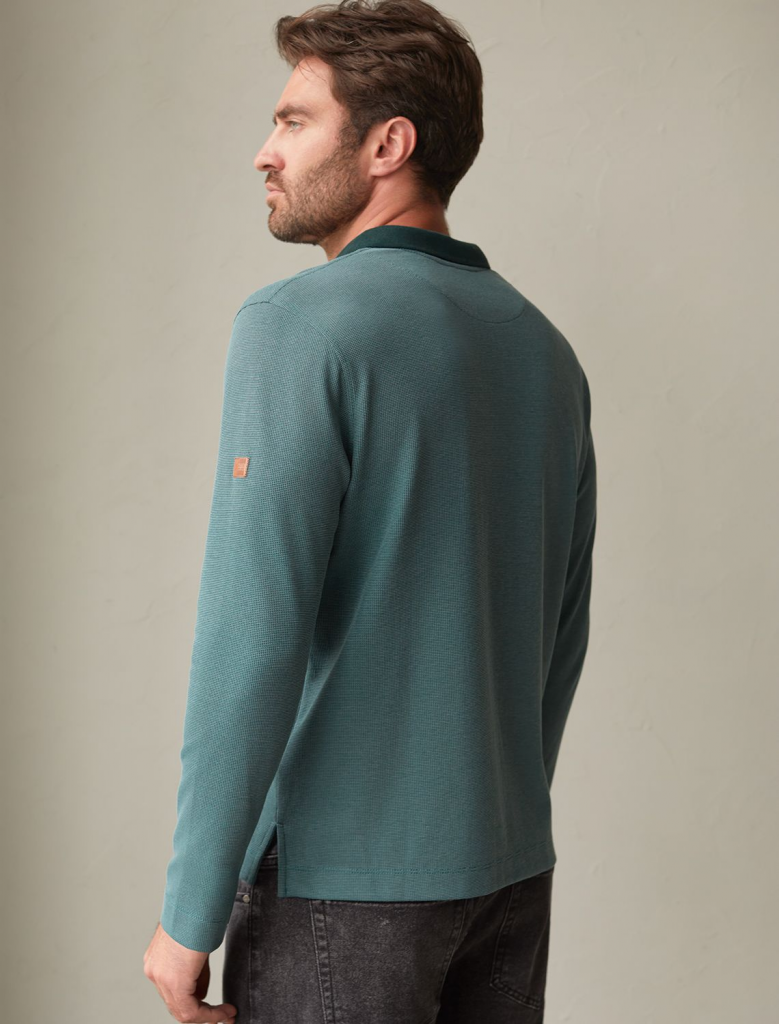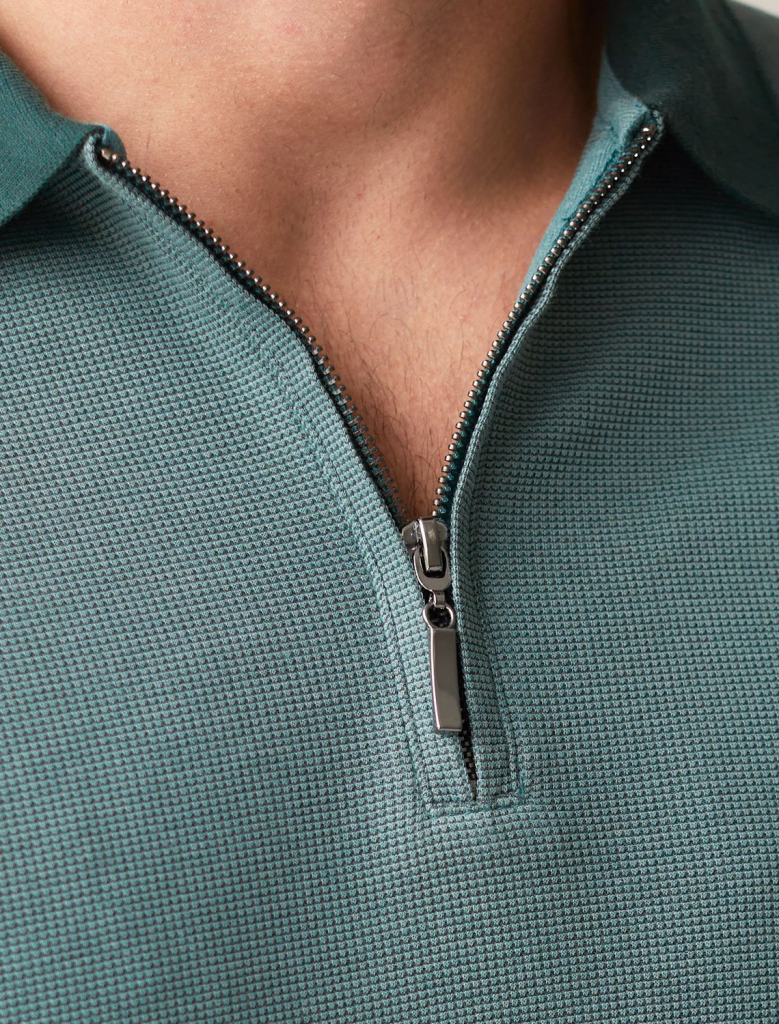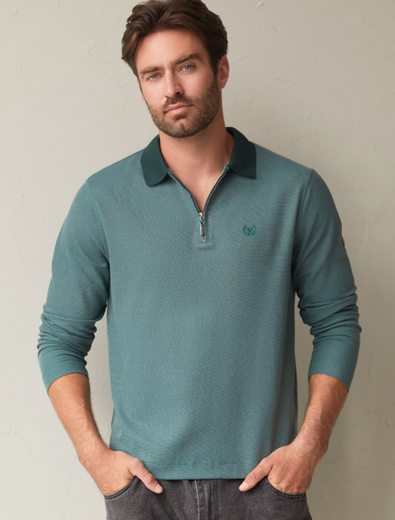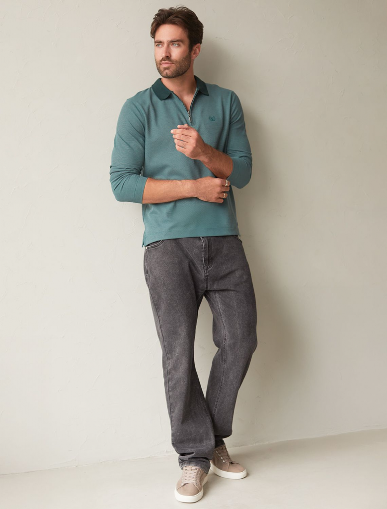 Стильный лонгслив дымчато-изумрудного цвета с плетеным воротником поло с застежкой на молнию выполнен из премиального хлопка в сочетании с эластаном .Невероятно мягкая ткань из натуральных волокон - она едва ощутима на коже и словно обнимает тело. Материал при касании кажется бархатистым, при движении он словно повторяет все мельчайшие линии фигуры. По свойствам материал сочетает в себе практичность и нежность: отлично провускает воздух, сохраняя ощущение свежести в течение всего дня, при этом созраняет тепло в прохладную погоду.Идеально подходит для чувствительной кожи, не вызывает раздражения и дискомфорта. Удобный отложной воротник делает образ современным и стильным, а длинные рукава с манжетами защищают руки при ветреной погоде. Поло хорошо садится по фигуре благодаря добавлению эластичных волокон — такой вариант подходит для мужчин любого роста и размеров, не стесняет движений и создает ощущение свободы и легкости. Лонгслив с молнией дополнен ненавязчивой вышивкой на груди в виде логотипа бренда в