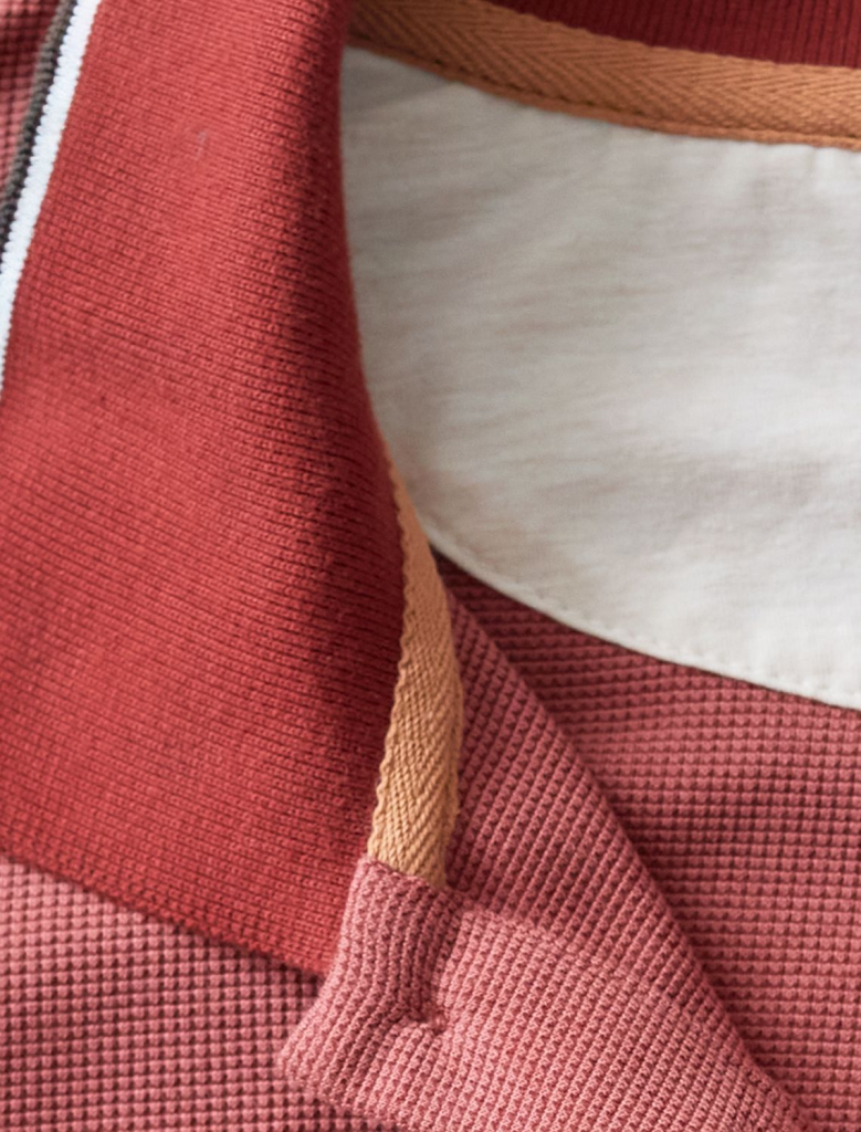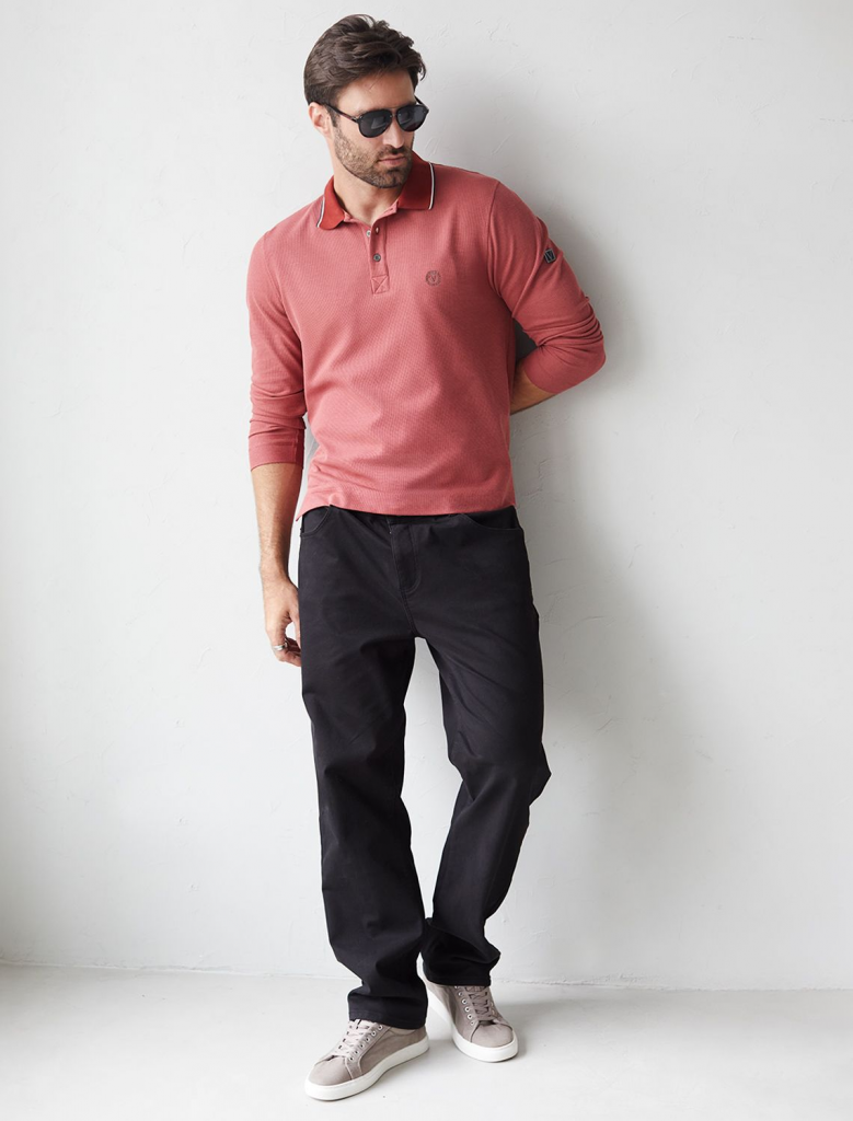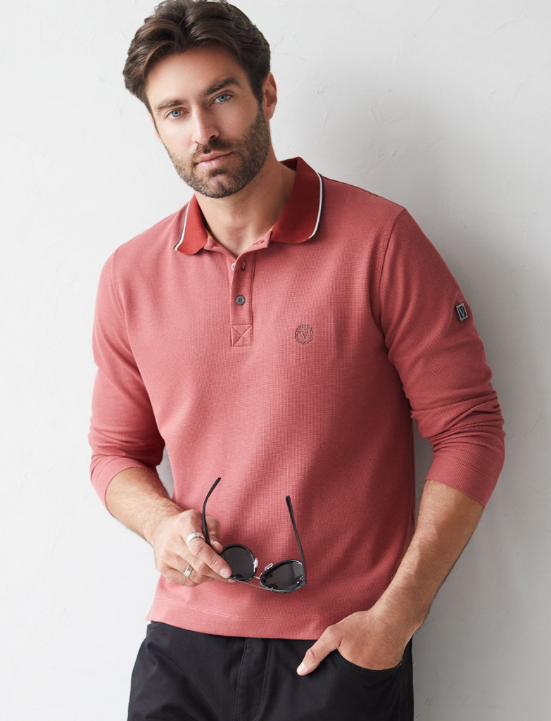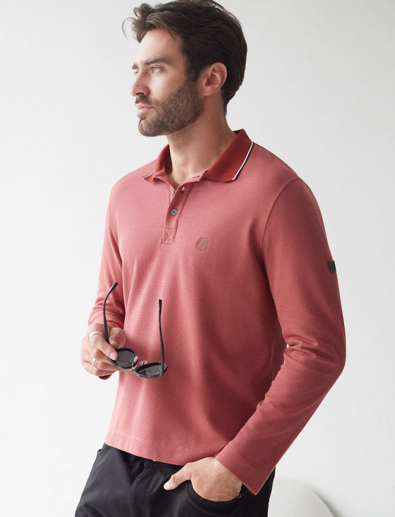 Стильный лонгслив кирпичного цвета с плетеным воротником поло с застежкой на пуговицы выполнен из премиального хлопка в сочетании с эластаном .Невероятно мягкая ткань из натуральных волокон - она едва ощутима на коже и словно обнимает тело. Материал при касании кажется бархатистым, при движении он словно повторяет все мельчайшие линии фигуры. По свойствам материал сочетает в себе практичность и нежность: отлично провускает воздух, сохраняя ощущение свежести в течение всего дня, при этом созраняет тепло в прохладную погоду.Идеально подходит для чувствительной кожи, не вызывает раздражения и дискомфорта. Удобный отложной воротник делает образ современным и стильным, а длинные рукава с манжетами защищают руки при ветреной погоде. Поло хорошо садится по фигуре благодаря добавлению эластичных волокон — такой вариант подходит для мужчин любого роста и размеров, не стесняет движений и создает ощущение свободы и легкости. Повседневный лонгслив дополнен ненавязчивой вышивкой на груди в виде логотипа бренда в тон
