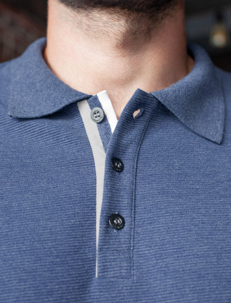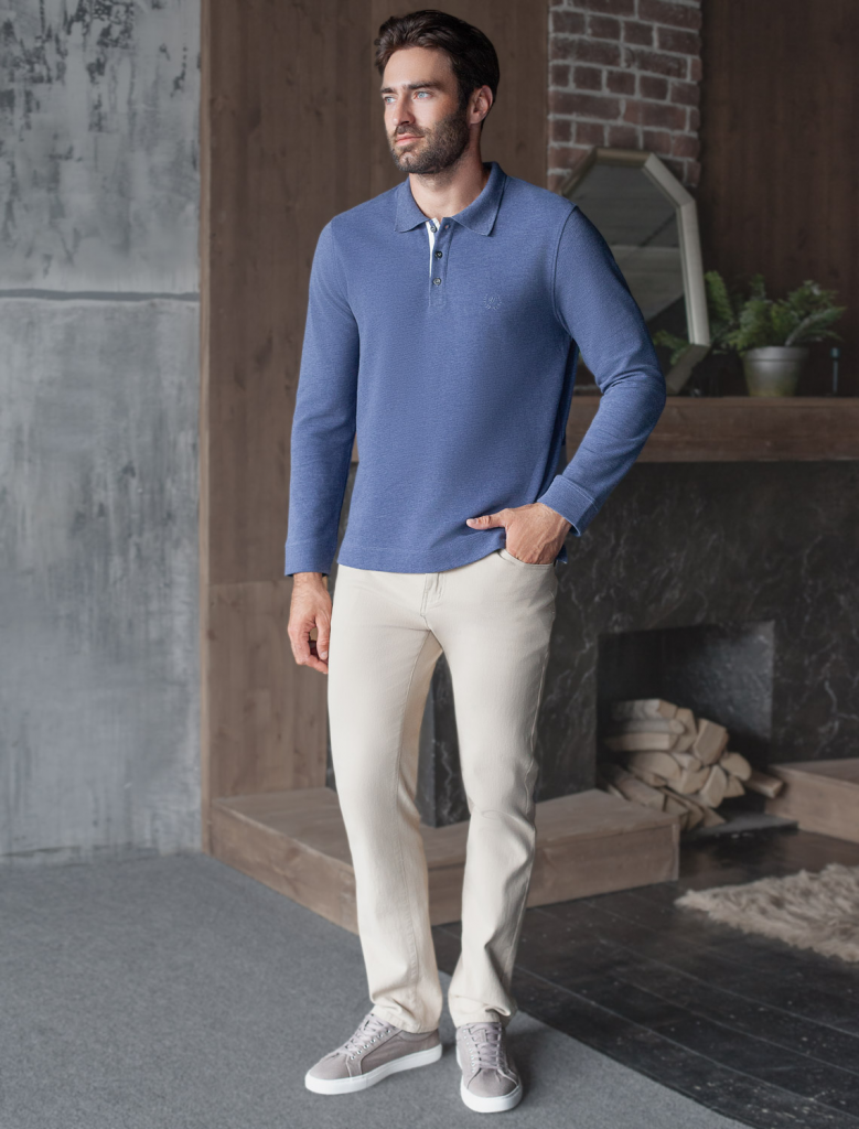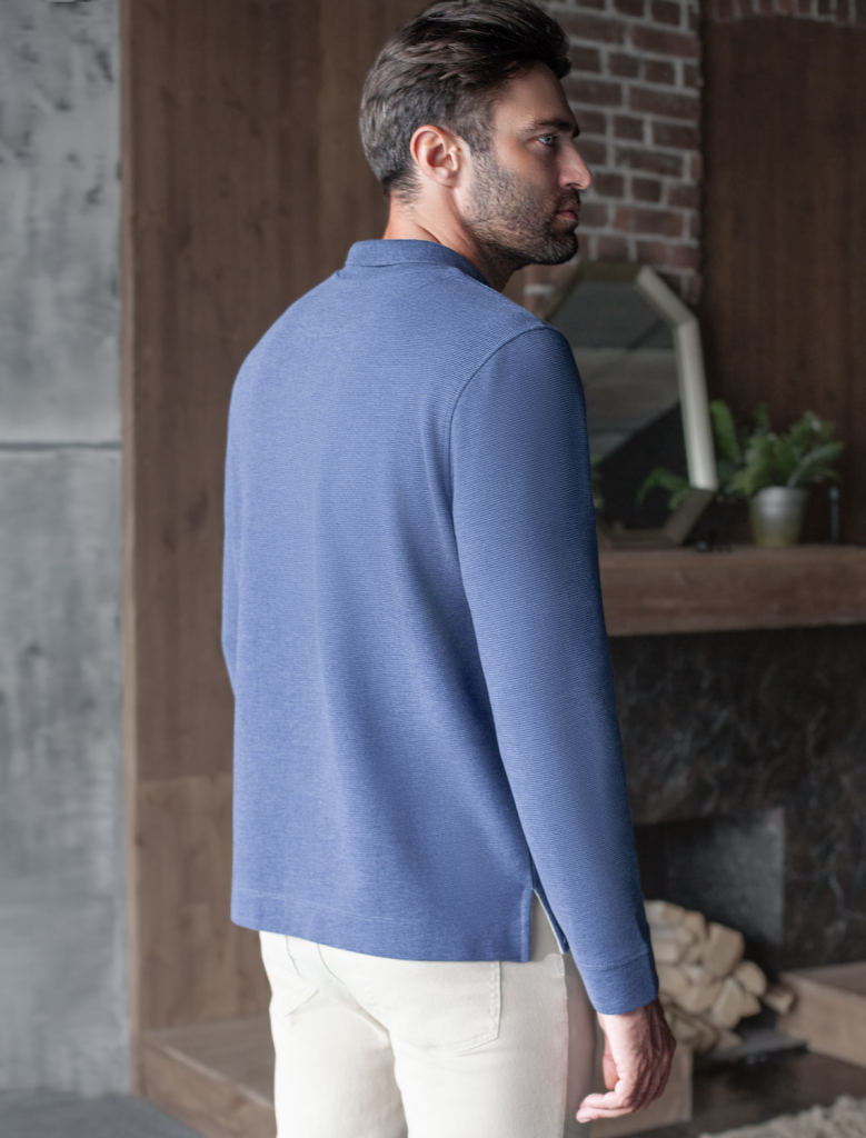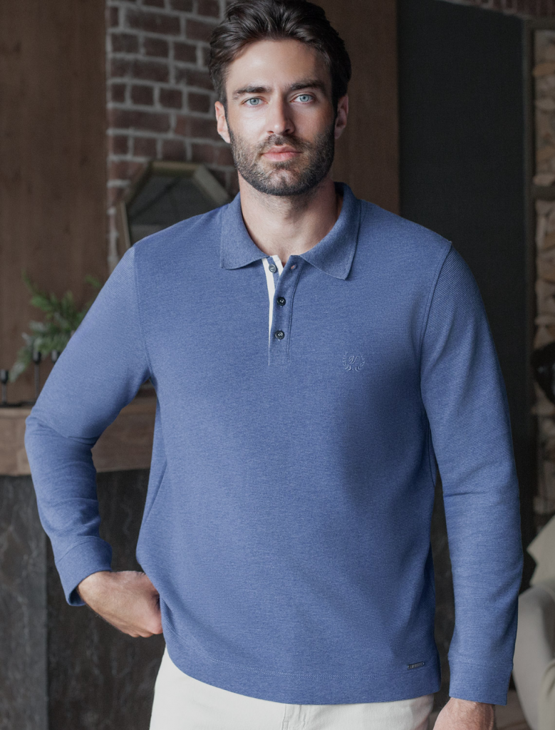 Стильный лонгслив синего цвета с эффектом меланж с плетеным воротником поло с застежкой на металлические пуговицы выполнен из премиального хлопка в сочетании с эластаном . Невероятно мягкая ткань из натуральных волокон - она едва ощутима на коже и словно обнимает тело. Материал при касании кажется бархатистым, при движении он словно повторяет все мельчайшие линии фигуры. По свойствам материал сочетает в себе практичность и нежность: отлично провускает воздух, сохраняя ощущение свежести в течение всего дня, при этом созраняет тепло в прохладную погоду.Идеально подходит для чувствительной кожи, не вызывает раздражения и дискомфорта. Удобный отложной воротник с контрастной отделкой делает образ современным и стильным, а длинные рукава с манжетами защищают руки при ветреной погоде. Поло хорошо садится по фигуре благодаря добавлению эластичных волокон — такой вариант подходит для мужчин любого роста и размеров, не стесняет движений и создает ощущение свободы и легкости. Лонгслив с пуговицами дополнен ненавязч