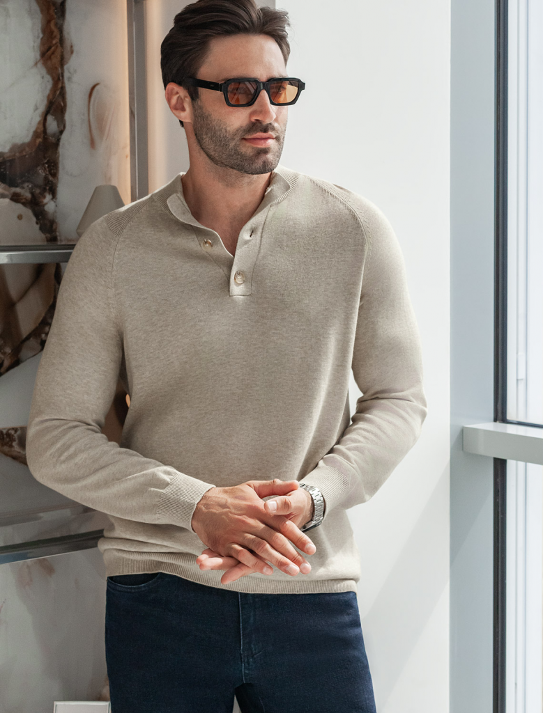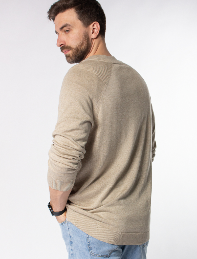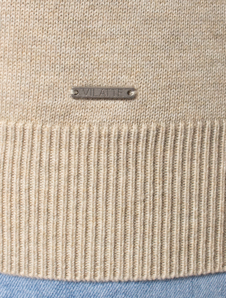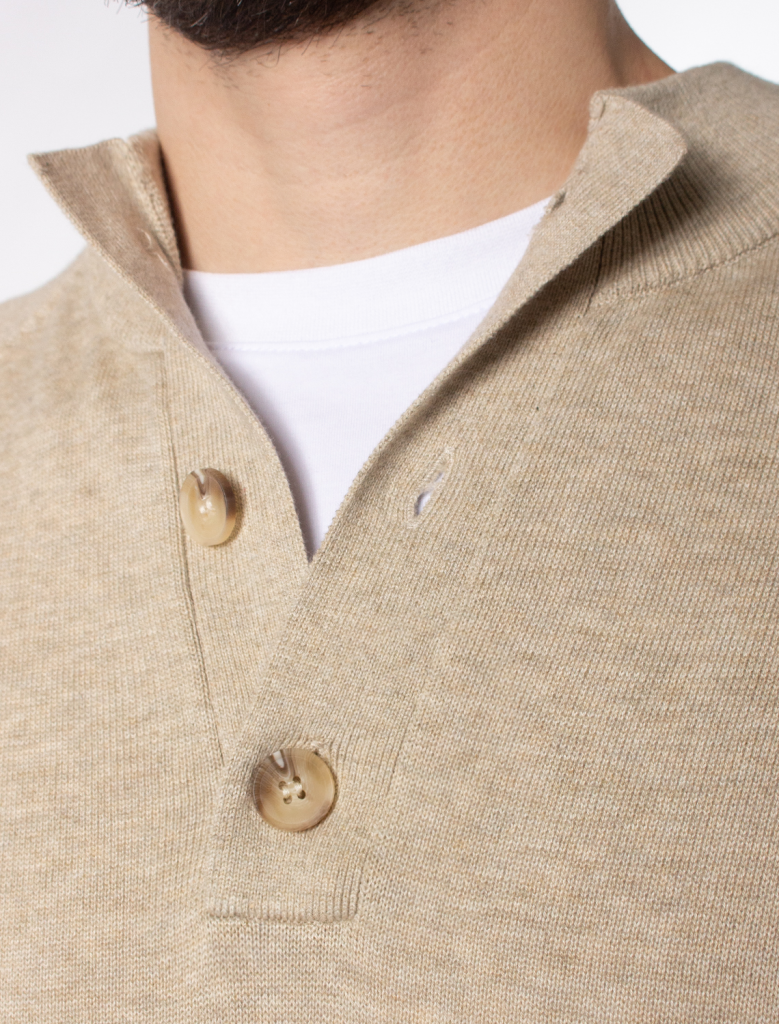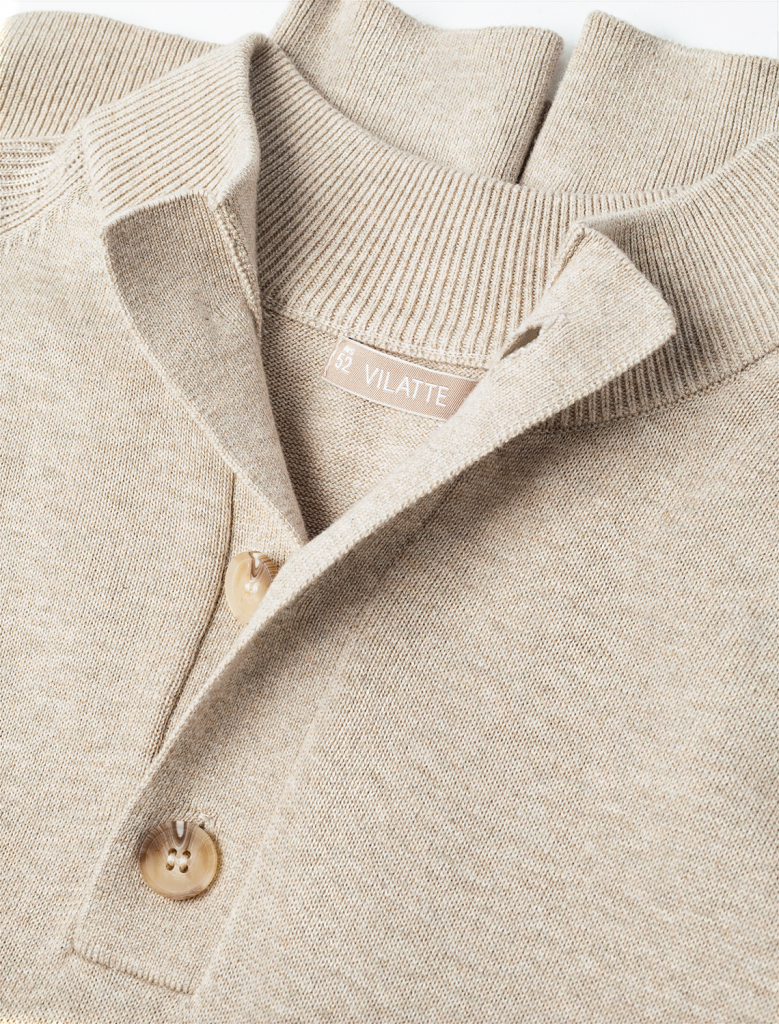 Светло-бежевый джемпер меланж с воротом, застегивающимся на черепаховые пуговицы, связали из мягкого хлопка с добавлением акрила, состав, который отлично согревает, не колется и при этом не перегревает тело, поэтому вещь получилась максимально комфортной для переменчивой погоды. Повседневный образ поддержат черные брюки, синие джинсы и броги.
